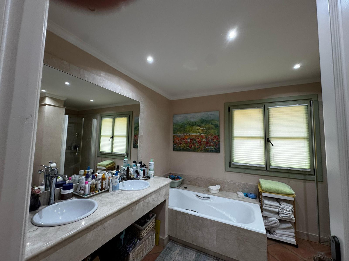 Cette résidence, agencée avec soin sur plusieurs niveaux, offre quatre chambres spacieuses et quatre salles de bains, dont deux privatives, ainsi qu'un WC séparé. L'intérieur, élégamment aménagé, est équipé de la climatisation, du chauffage au sol et du chauffage au gaz pour un confort optimal en toute saison. Le sol en marbre apporte une touche raffinée, tandis que la cuisine entièrement équipée et le mobilier inclus permettent une installation immédiate. Une charmante cheminée dans la pièce de vie principale crée une ambiance chaleureuse et accueillante, idéale pour se détendre ou recevoir.