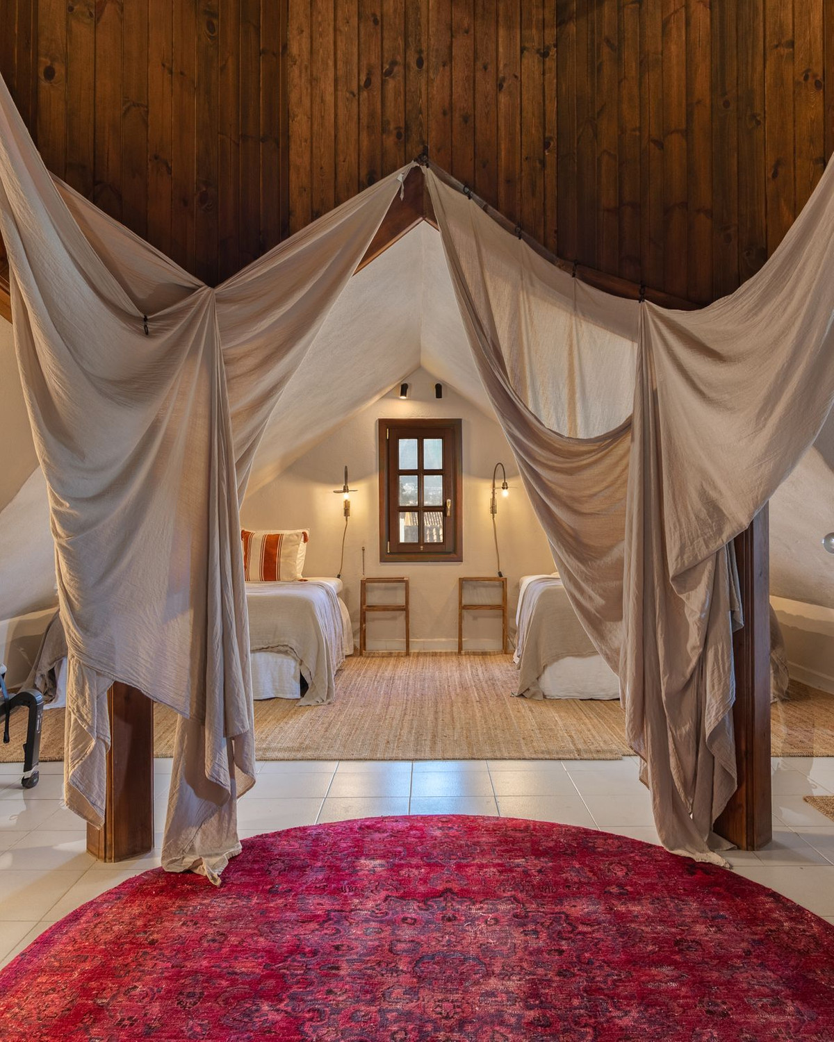 Le deuxième étage, relié par un escalier ouvert, se fond harmonieusement avec le niveau inférieur, où la hauteur sous plafond impressionnante accentue la sensation d'espace et laisse entrer une abondante lumière naturelle. À ce niveau, une quatrième chambre avec salle de bains privative est complétée par un grenier aménagé d'environ 50 m². L'agencement en T crée deux espaces de couchage supplémentaires ainsi qu'un grand dressing. Les plafonds mansardés confèrent un charme particulier et une atmosphère chaleureuse et intime.