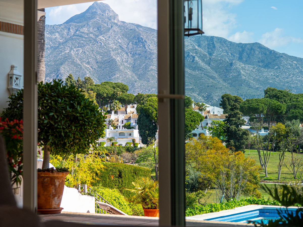 Découvrez une villa andalouse d'exception, idéalement située en première ligne face à l'Aloha Golf Club, offrant une vue panoramique à couper le souffle qui s'étend sur les fairways jusqu'à l'emblématique La Concha.