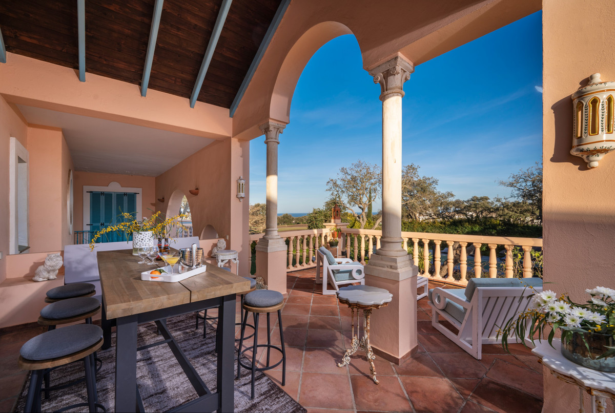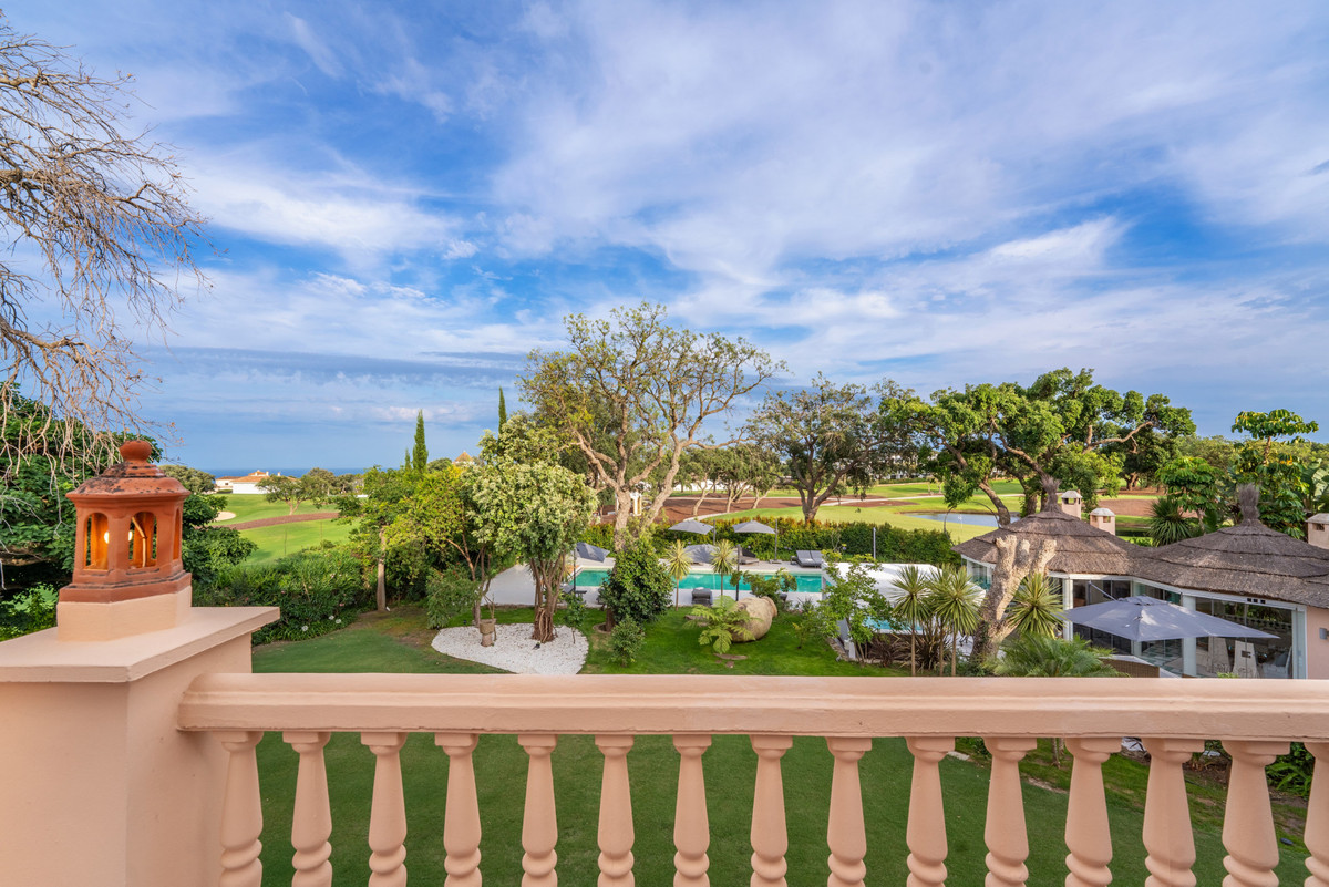 À l'étage, une galerie accueillante avec coin salon et espace bureau, agrémentée d'une cheminée, s'ouvre sur une vaste terrasse offrant une vue imprenable sur le golf et la mer. Ce niveau comprend également trois suites, chacune dotée d'une terrasse privative, conçues pour un confort et une intimité optimaux.