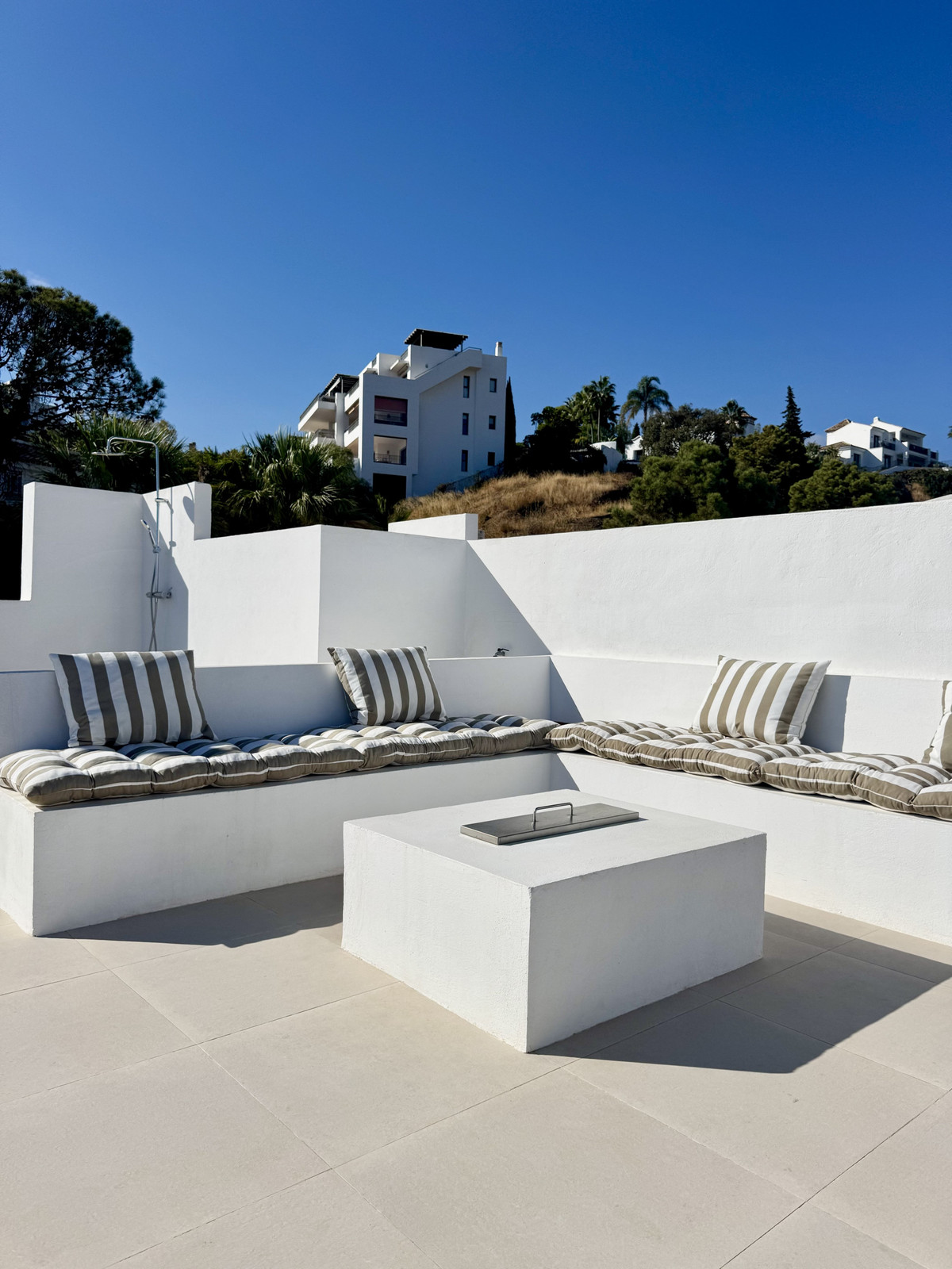 The terrace has a dining table, plenty of storage, and a bathroom. It also gets morning and midday light. The sun will be shining all day long as you go onto the roof terrace, so why not take advantage of the outdoor shower or the raised sun deck to cool off? Evenings can be spent either by the barbecue/outdoor kitchen area or in front of the custom fire table.