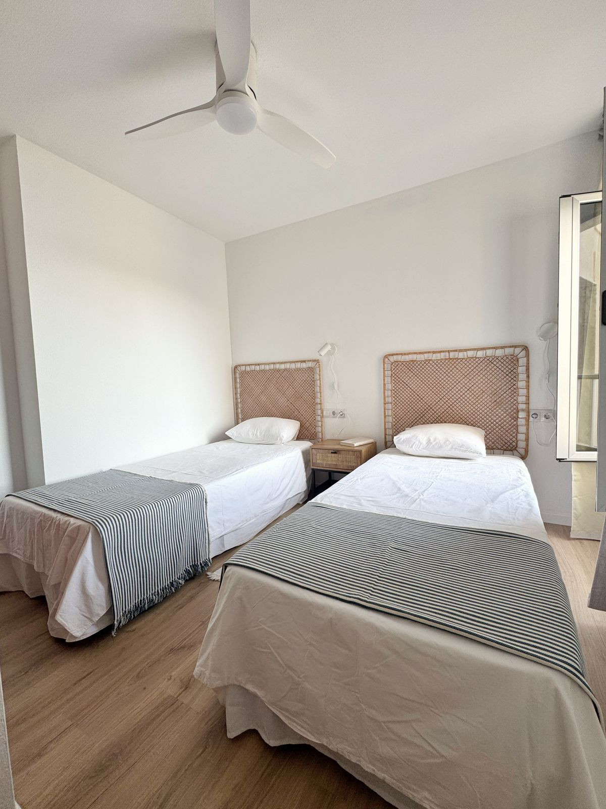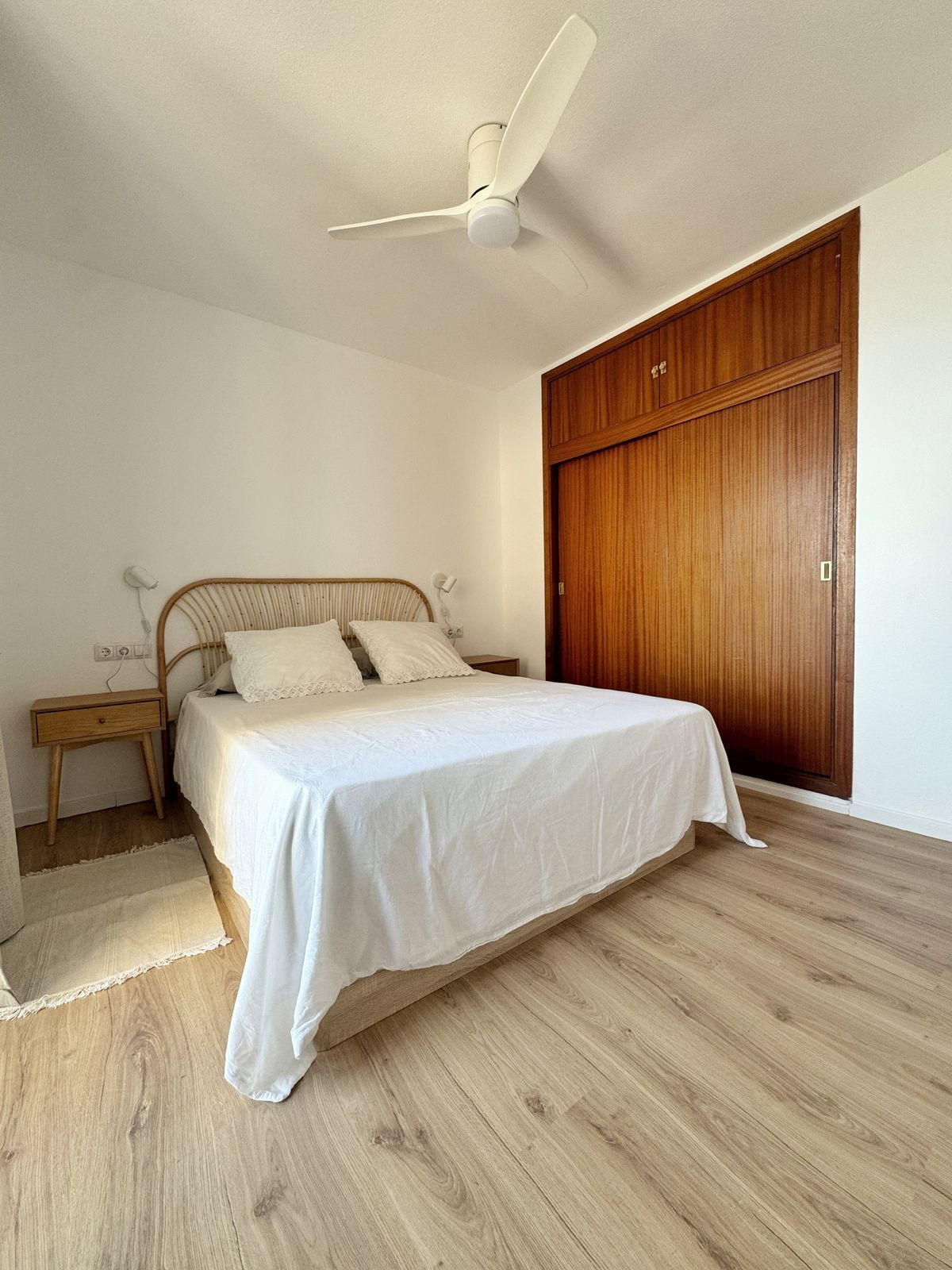 The property features 2 bedrooms with built-in wardrobes, 1 full bathroom, centralized air conditioning and ceiling fan-lights in the bedrooms. Bright living room with access to a terrace, perfect for enjoying the surroundings and the Costa del Sol climate. The apartment also includes access to a communal parking area for added convenience.