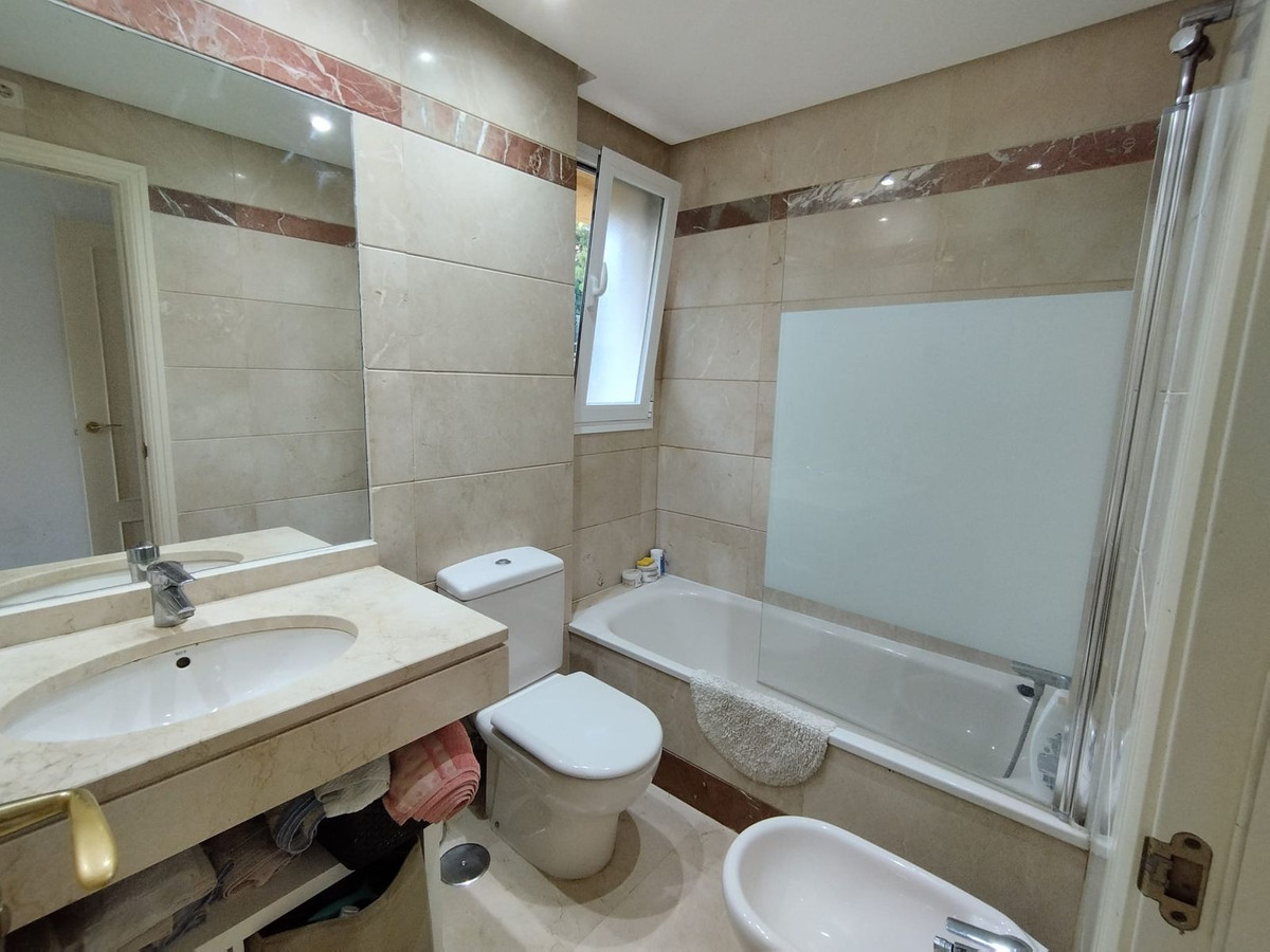 The property has two bedrooms with built-in wardrobes, two full bathrooms (one en suite), a spacious living room with access to a terrace, and a fully equipped separate kitchen. Air conditioning (hot/cold), an elevator, 24-hour security, paddle tennis courts, two swimming pools (one open year-round), a children's area, and large green areas for walking.