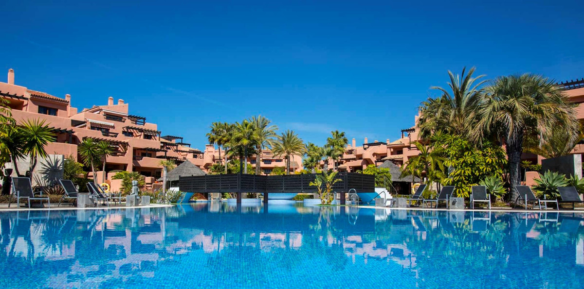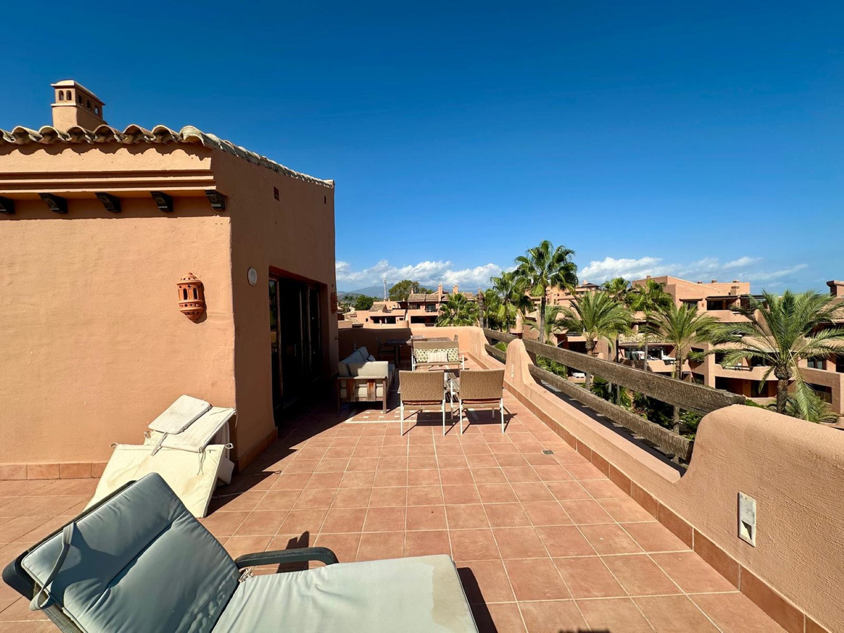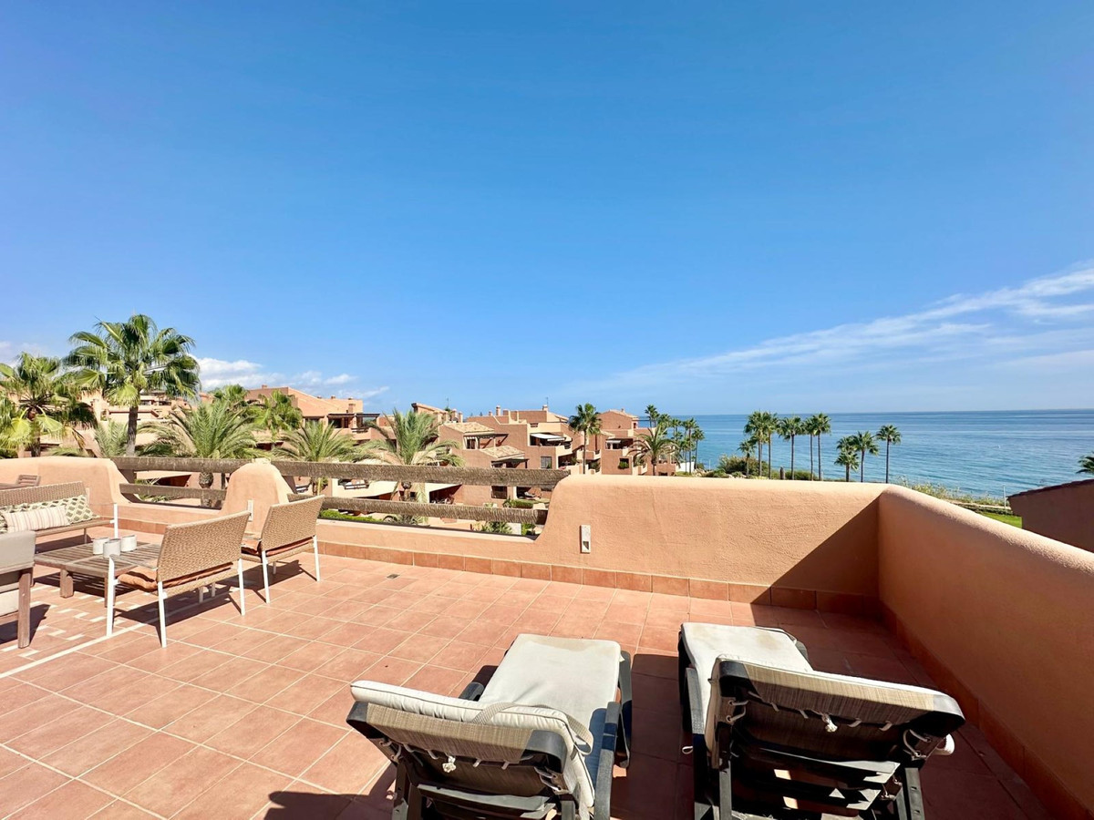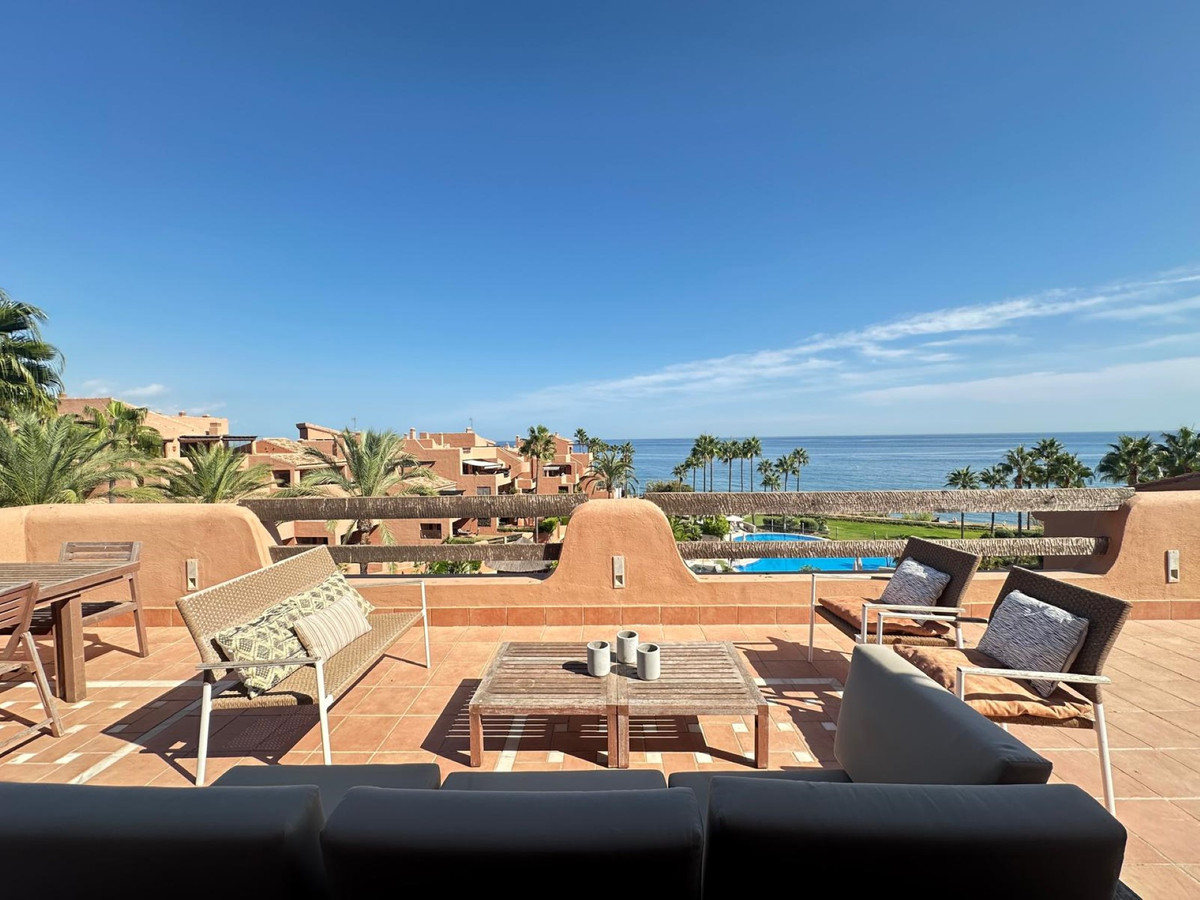 Presenting a sophisticated penthouse situated in the exclusive Mar Azul development, East of Estepona town. This 1 bedroom, 1 bathroom property spans 80m² of meticulously maintained living space, complemented by an expansive 100m² private terrace with panoramic views to the sea and surroundings. Ideally positioned on the front line of the beach, the residence enjoys stunning panoramic, sea, garden, and pool views, offering a rare opportunity to embrace the quintessential Costa del Sol lifestyle.