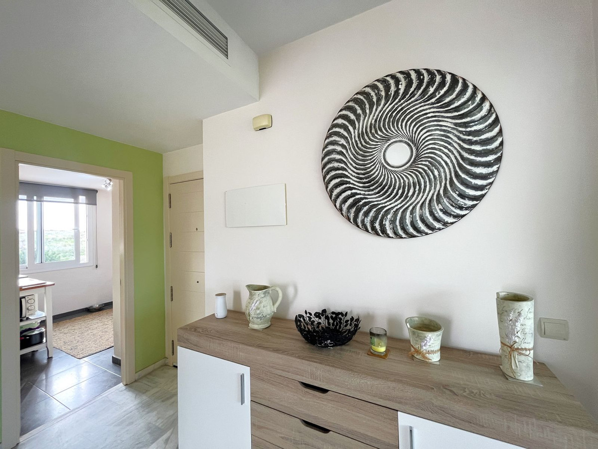 La propriété se distingue par sa grande terrasse panoramique offrant une vue imprenable sur le golf et les montagnes, l'endroit idéal pour profiter du soleil et de la tranquillité. Dès l'entrée, vous découvrirez un salon-salle à manger lumineux et spacieux donnant sur une terrasse vitrée avec rideaux coulissants, idéale comme espace de vie supplémentaire. La cuisine entièrement rénovée et équipée offre des finitions haut de gamme.