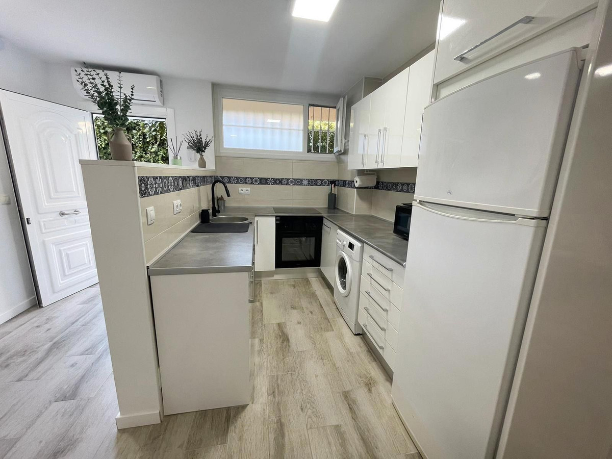 Le salon-salle à manger est très cosy, idéal pour se détendre après une journée à la plage. La cuisine est entièrement équipée et dispose de placards intégrés optimisant l'espace de rangement.