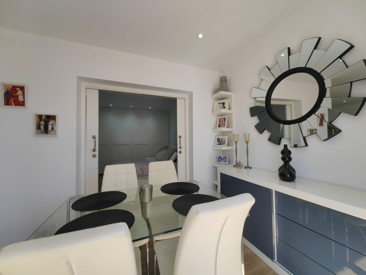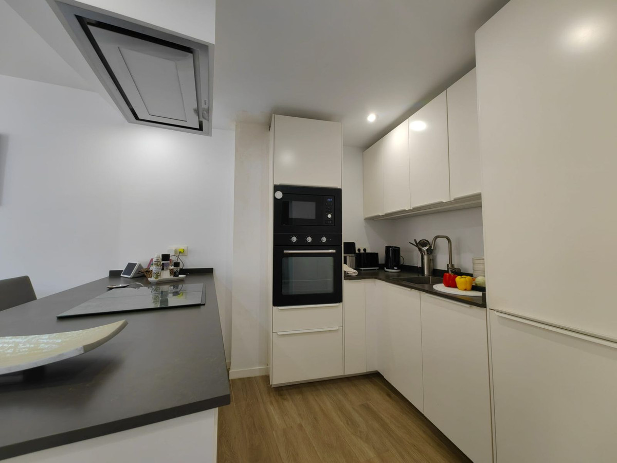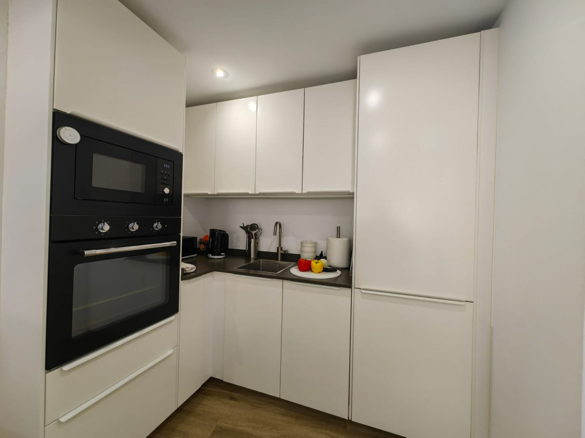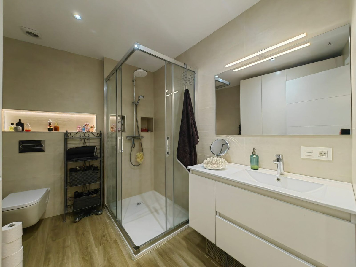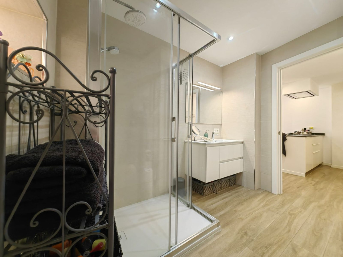 La chambre est complétée par une salle de bain moderne avec douche à l'italienne à portes coulissantes en verre et WC suspendus. Chaque détail a été soigneusement rénové selon les normes contemporaines les plus strictes, y compris une cuisine entièrement équipée avec des appareils électroménagers de qualité.