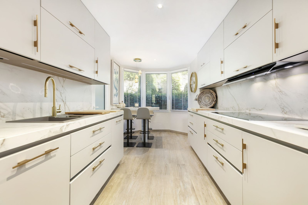 La propriété a été entièrement transformée avec une toute nouvelle cuisine sur mesure et une buanderie séparée, toutes deux conçues pour allier fonctionnalité et style. Le vaste salon et la salle à manger formelle offrent des dimensions exceptionnelles, offrant un cadre élégant pour se détendre et recevoir. Chacune des trois chambres spacieuses dispose de sa propre salle de bain attenante, joliment aménagée, et d'un cabinet de toilette contemporain pour les invités.