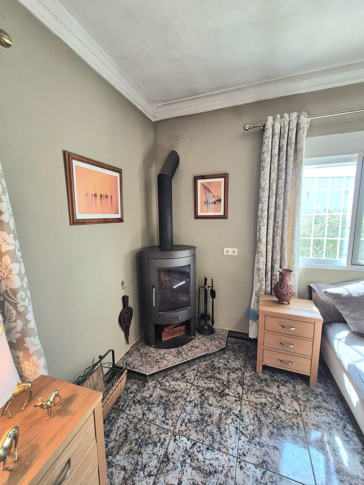 La propriété est située au bout d'une belle route goudronnée. Un grand portail double mène à un grand espace pavé sur le côté de la maison, avec de nombreuses places de parking. De là, vous entrez dans la maison : à droite, vous trouverez un salon avec cheminée et un accès à la cour arrière où se trouve la buanderie/cellier. De retour dans le séjour, vous trouverez la cuisine entièrement équipée et une salle de bain avec douche. Dans le couloir, vous trouverez à gauche une chambre double et une salle de bain avec une belle baignoire. La chambre principale se trouve juste en face avec accès à la terrasse couverte et à la piscine. À droite, la troisième chambre donne également accès à cette même terrasse couverte. Les propriétaires actuels utilisent cette pièce comme second salon. Un escalier longeant l'avant de la maison mène au solarium d'où vous profiterez d'une vue panoramique imprenable sur les montagnes.