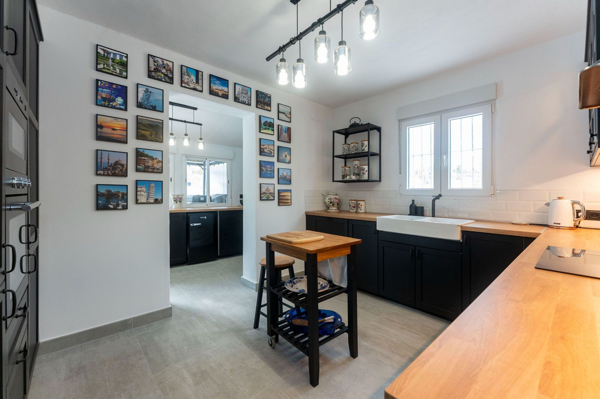 Le rez-de-chaussée dispose d'une spacieuse terrasse couverte, idéale toute l'année, qui mène à un salon-salle à manger lumineux et aéré. De là, une arche mène à une chambre double avec de nombreux placards, une salle de bain entièrement équipée avec baignoire et une cuisine spacieuse avec buanderie séparée. Cette buanderie offre des rangements supplémentaires et un accès direct à la piscine et à la cuisine d'été, créant ainsi une ambiance conviviale pour les réceptions en plein air.