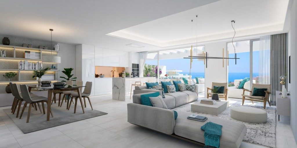 The apartments benefit from high end fittings and fixtures, including open plan kitchens A-rated energy appliances as standard and have incredible views of both the mountains and the sea, from terraces due to their hilltop location.