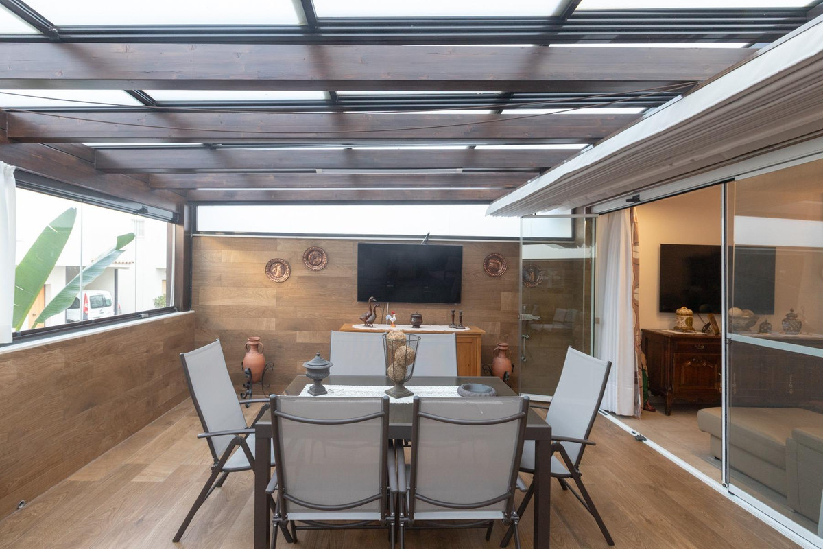 The master bedroom has access to the terrace, the bathroom is renovated, and there is another bedroom with a comfortable dressing room. The living room connects to a glazed terrace, perfect for year-round use; it even has air conditioning! And it comes with a garage and storage room included in the price.