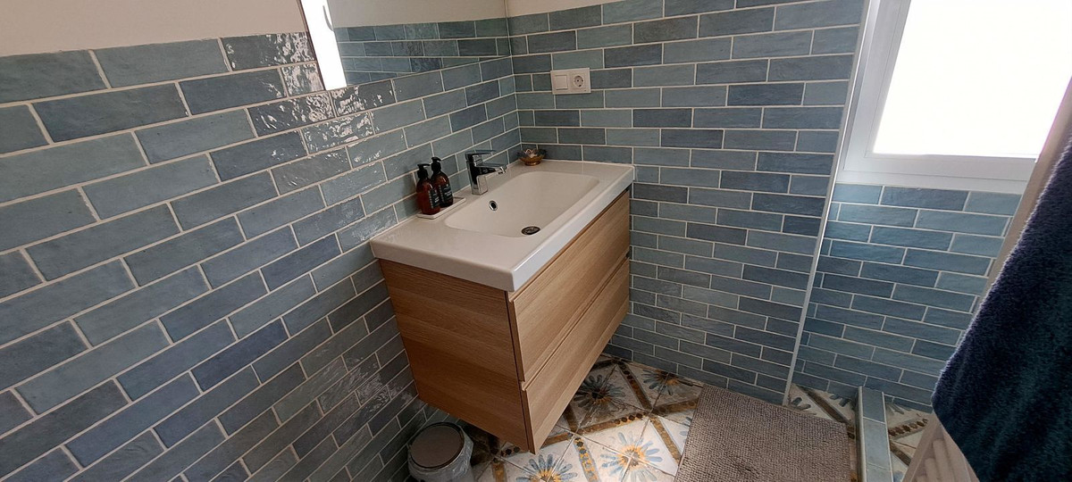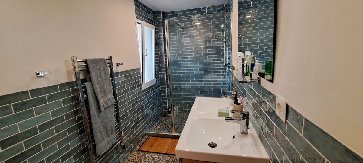 On the other side of the house, we enter the bedroom area. The first two bedrooms are spacious and equipped with modern air conditioning. These two bedrooms share a modern bathroom with a sink and spacious walk-in shower in the middle. The toilet is located in a separate room, equipped with a sliding door to make optimal use of the available space.