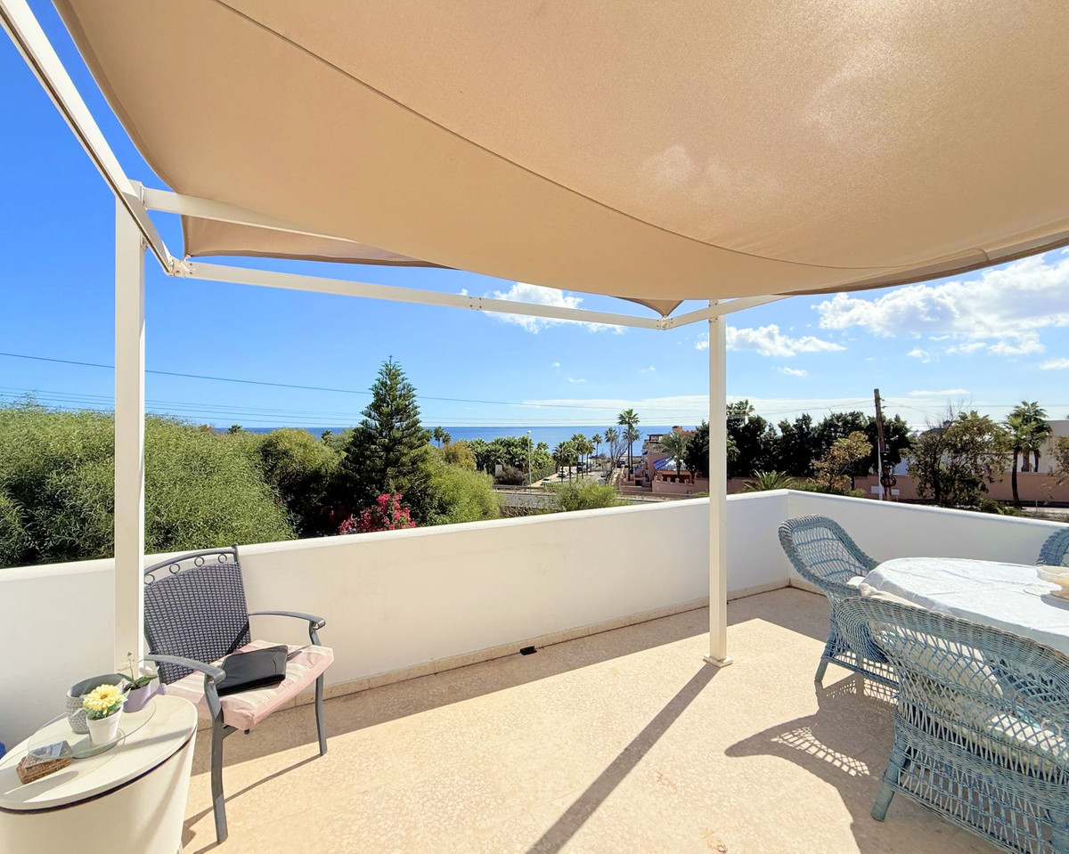 La propriété est répartie sur deux niveaux. Dès l'entrée, un charmant patio vous accueille et mène au rez-de-chaussée, qui comprend un salon lumineux, une cuisine indépendante et une terrasse offrant une agréable vue sur la mer – idéale pour se détendre et profiter du calme environnant.