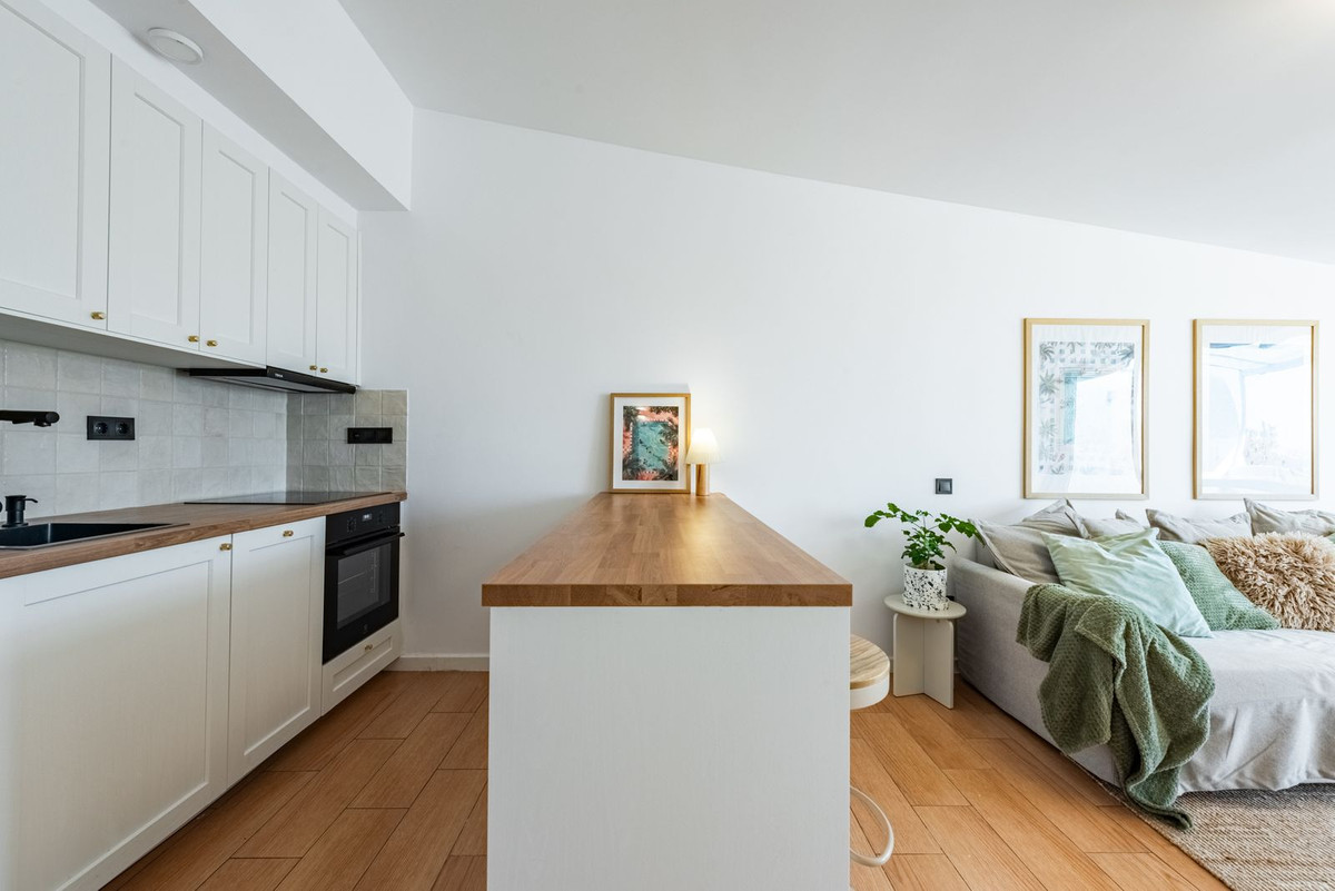 Situé à mi-étage, cet appartement de plain-pied comprend une chambre spacieuse avec placards intégrés, une salle de bains et un couloir menant à une élégante cuisine ouverte sur le séjour. Le séjour s'ouvre sur une terrasse ensoleillée exposée plein sud offrant une vue imprenable sur la mer – l'endroit idéal pour se détendre, dîner et profiter du soleil en toute saison. Pour ceux qui le souhaitent, l'accès à une agréable piscine commune est également possible moyennant un petit supplément, particulièrement appréciable durant les beaux jours d'été.