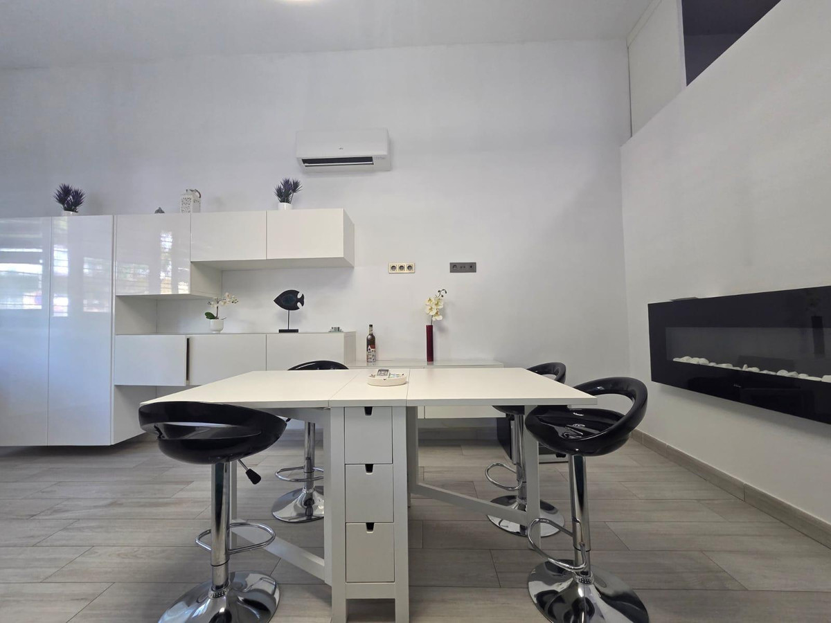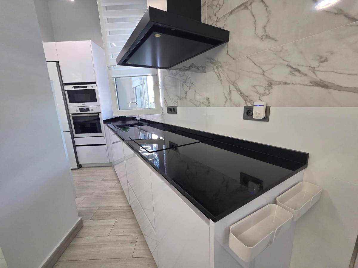 Cuisine américaine entièrement équipée : plan de travail en Silestone, plaque de cuisson vitrocéramique, lave-vaisselle, four encastré et hotte aspirante. Elle communique directement avec le séjour, créant ainsi un espace ouvert et convivial.