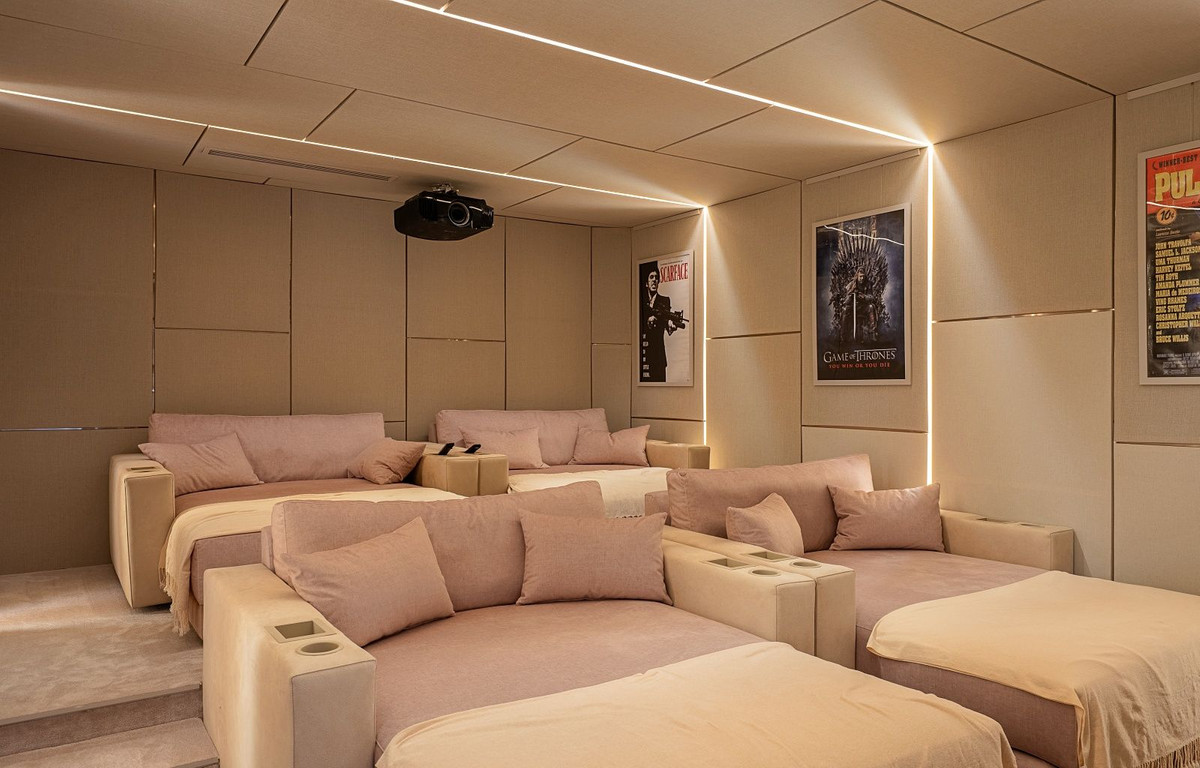 Le niveau inférieur de la villa abrite une quatrième chambre avec salle de bains, ainsi que de nombreux espaces de loisirs : salle de jeux, cave à vin impressionnante, salle de cinéma et salle de sport entièrement équipée. Un ascenseur privé dessert les trois niveaux de la maison pour un confort optimal.