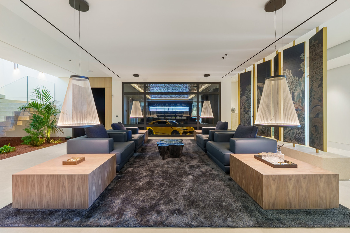 Le niveau inférieur, d'une superficie de près de 800 m², est dédié au bien-être et aux loisirs. Baigné de lumière naturelle grâce à ses baies vitrées, il comprend une salle de cinéma, une salle de sport professionnelle, une salle de jeux, un spa avec piscine intérieure et jacuzzi, ainsi qu'un bureau privé. Trois chambres supplémentaires avec salle de bains privative – dont une avec accès indépendant et kitchenette – offrent une grande flexibilité pour les invités ou le personnel. Un garage sécurisé pour huit voitures, équipé de deux bornes de recharge pour véhicules électriques, complète cet espace.