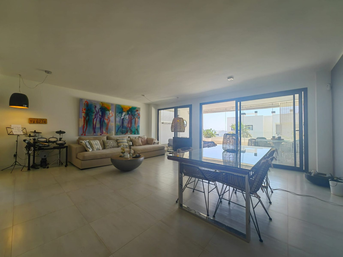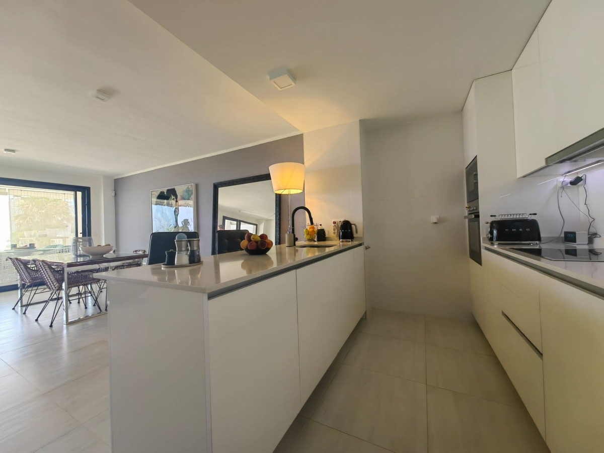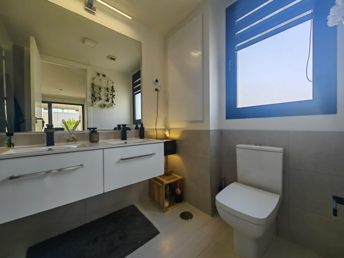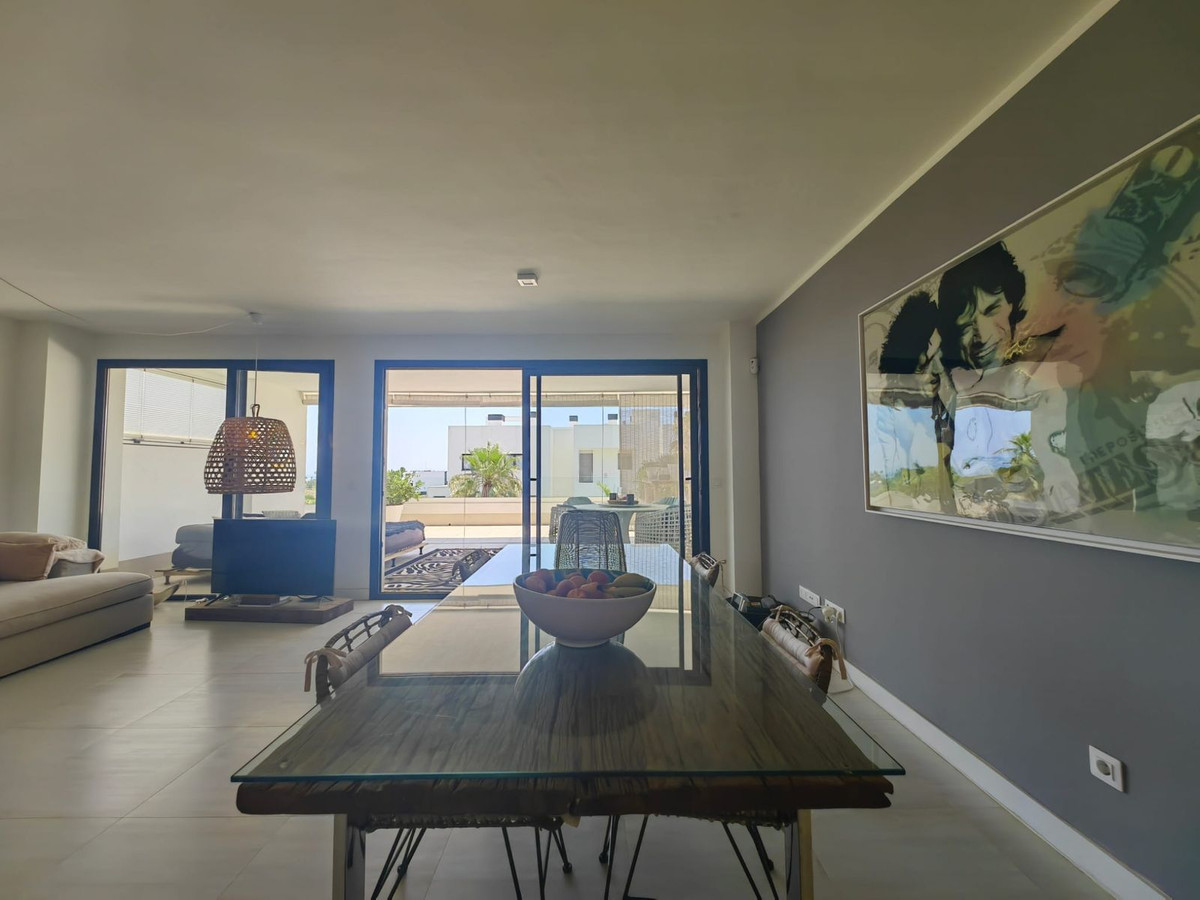 Le séjour lumineux et ouvert s'ouvre sur une grande terrasse semi-couverte exposée plein sud avec vue partielle sur la mer, créant ainsi un cadre idéal pour profiter du soleil de la Costa del Sol tout au long de la journée. À l'arrière, un jardin privé avec terrasse en bois offre un havre de paix, idéal pour les repas en plein air, les barbecues ou tout simplement pour se détendre.