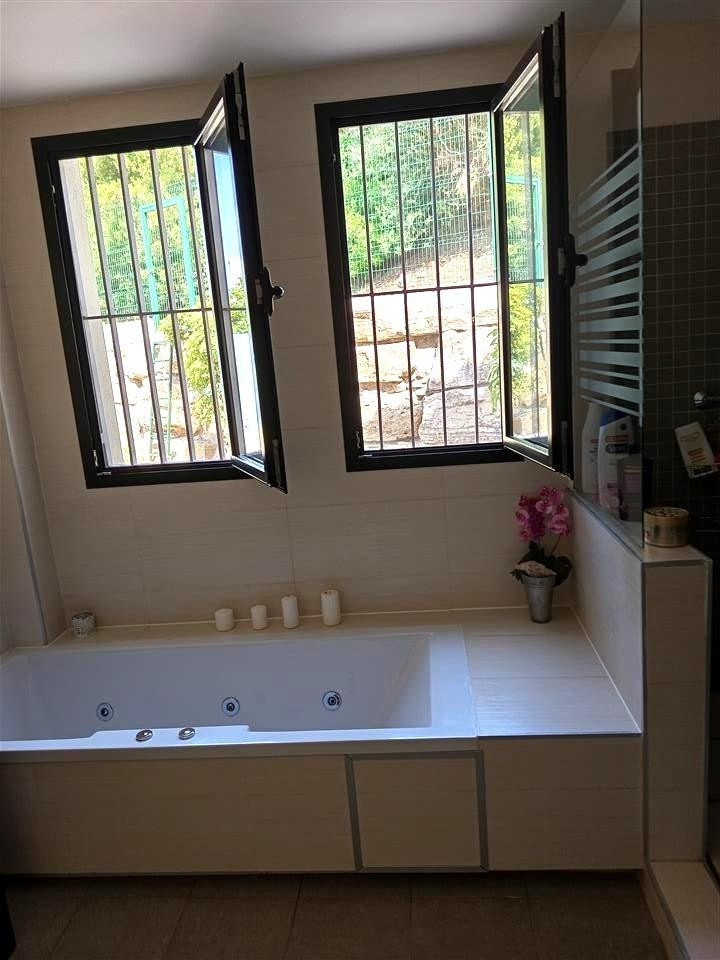 Trois chambres spacieuses et deux salles de bains complètes, dont une attenante avec baignoire balnéo et douche. Les deux salles de bains sont dotées de fenêtres donnant sur le jardin, assurant ainsi lumière naturelle et ventilation.