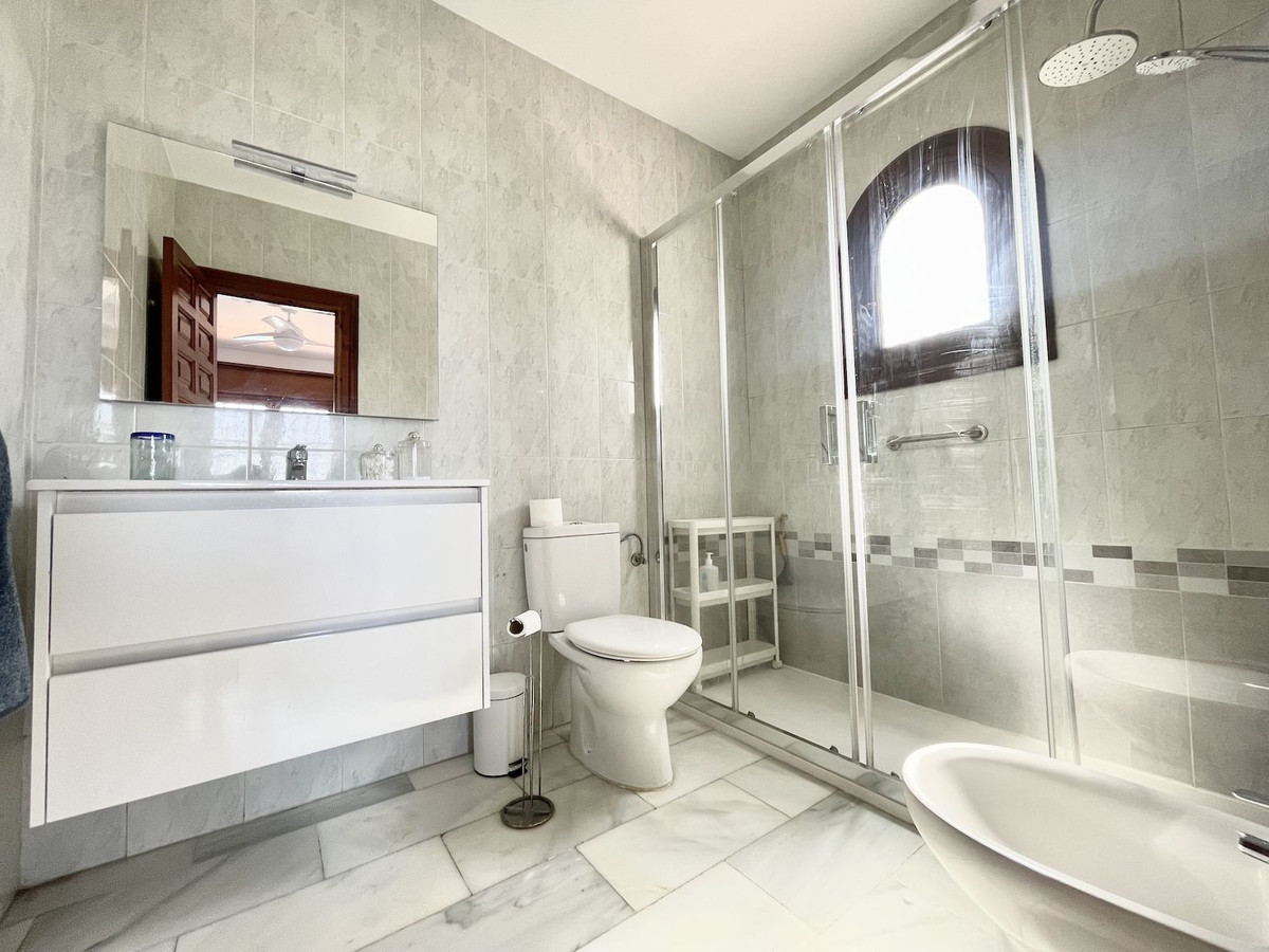 À l'intérieur, la maison dégage un charme espagnol classique, avec un salon spacieux doté d'une cheminée chaleureuse, idéale pour les soirées plus fraîches, et la climatisation pour un confort optimal toute l'année. Elle comprend deux chambres de belles dimensions avec placards intégrés et deux salles de bains, dont une suite parentale.