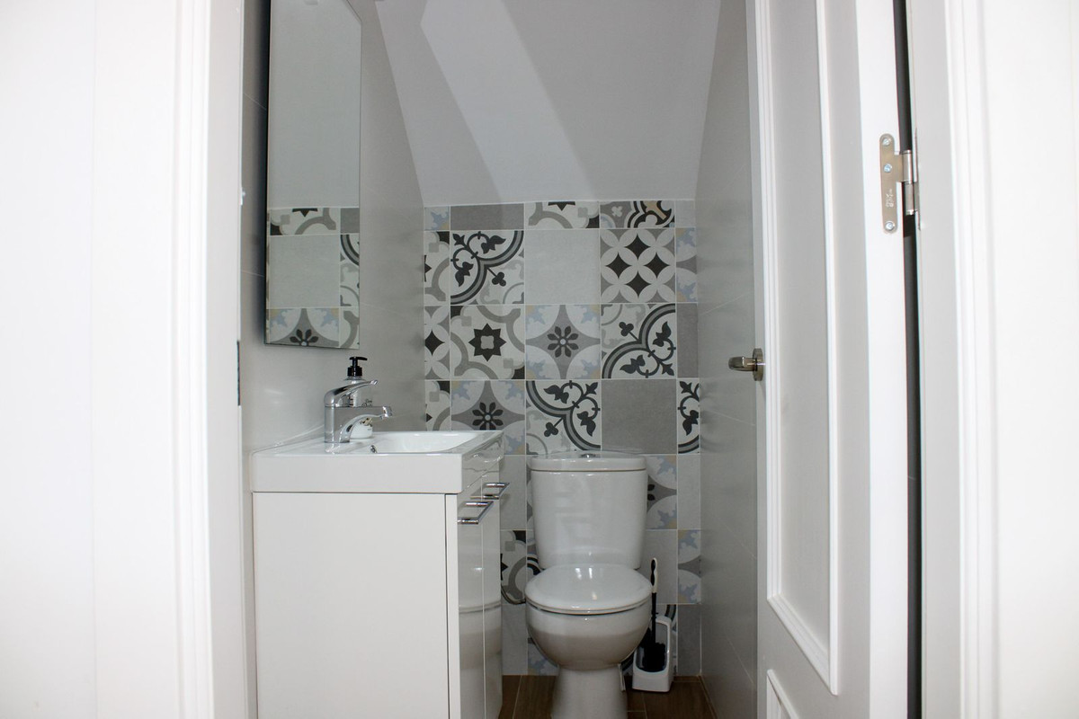 Au rez-de-chaussée, vous trouverez un appartement de deux chambres, une salle de bains et des toilettes. La cuisine entièrement équipée s'ouvre sur le séjour, qui donne également sur une terrasse intérieure vitrée très lumineuse. L'une des chambres bénéficie aussi d'un accès à une autre terrasse intérieure, idéale pour savourer votre café du matin ou un verre de vin en soirée.