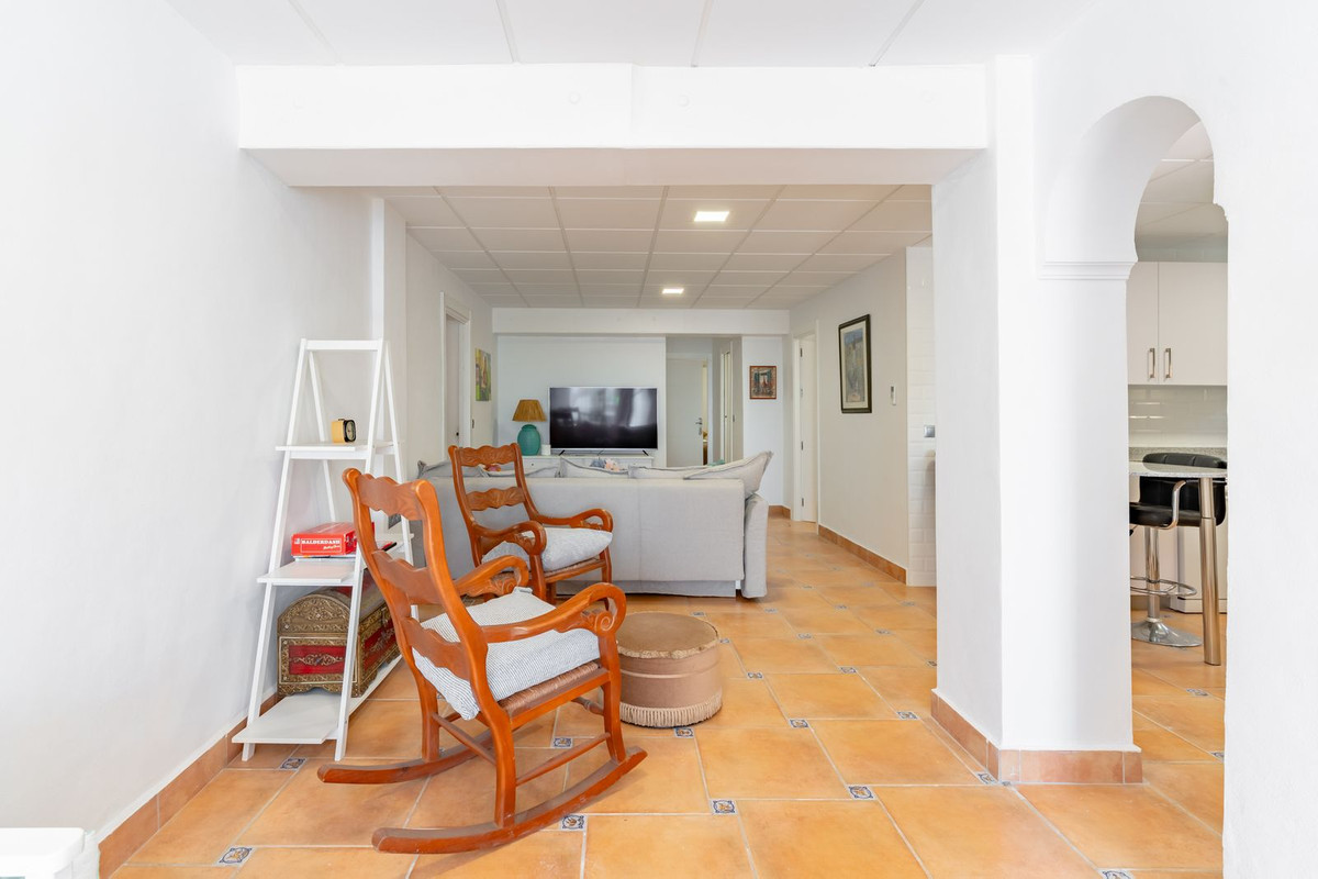 À l'intérieur, le rez-de-chaussée comprend un vaste séjour/salle à manger baigné de lumière naturelle, une cuisine entièrement équipée et trois chambres, dont deux avec salle de bains privative. Depuis le séjour, on accède à une superbe cour intérieure de style andalou, agrémentée d'une fontaine apaisante : un lieu idyllique pour se détendre.