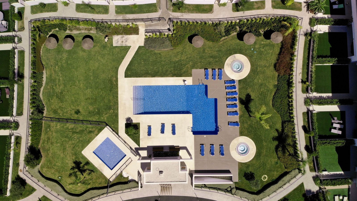 Le lumineux séjour-salle à manger ouvert s'ouvre naturellement sur la terrasse et le jardin privatif exposés ouest, créant une connexion harmonieuse entre confort intérieur et loisirs extérieurs. De grandes baies vitrées baignent l'espace de lumière naturelle et offrent une vue magnifique sur les jardins et les piscines communs. Les prestations haut de gamme incluent le chauffage au sol, la climatisation centralisée, un système de pompe à chaleur performant, la fibre optique ultra-rapide et un mobilier de bon goût, empreint d'une sophistication moderne.