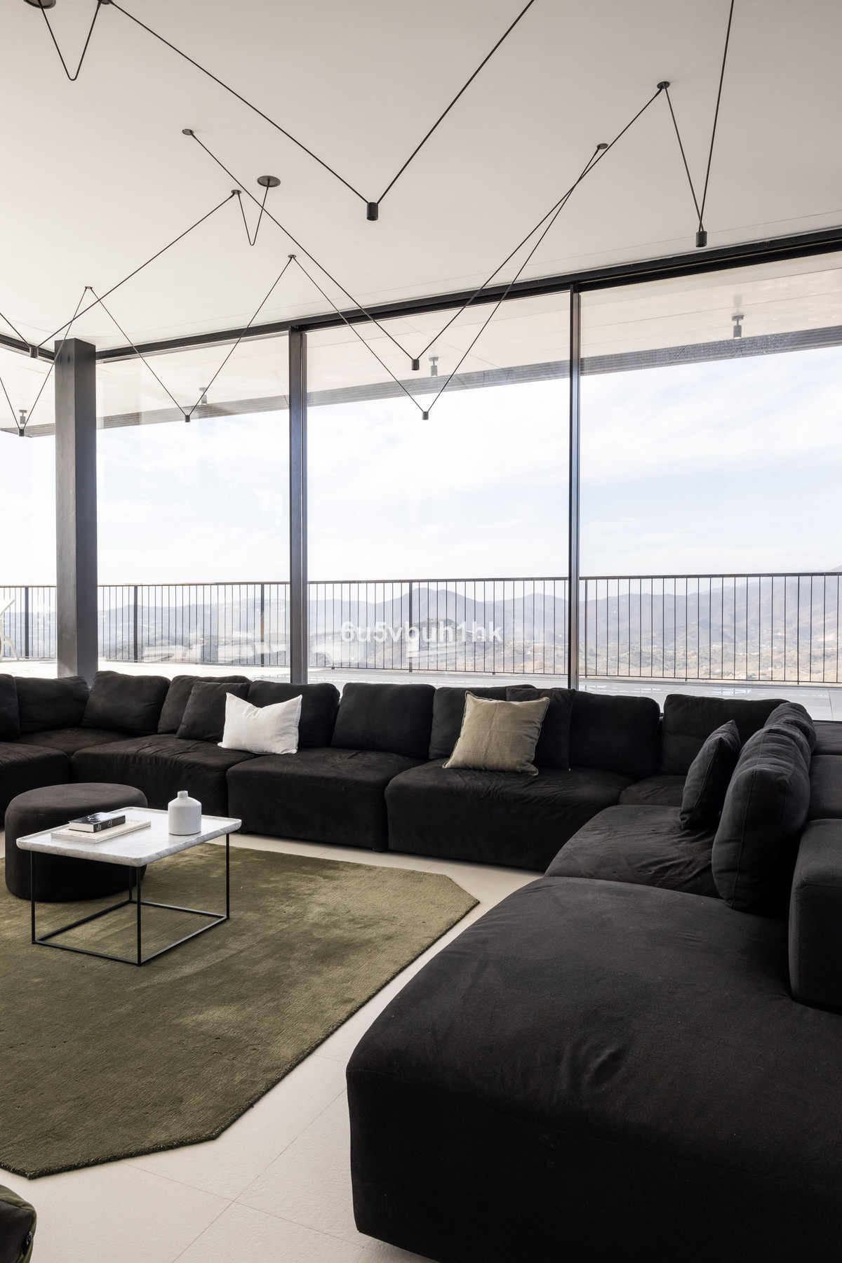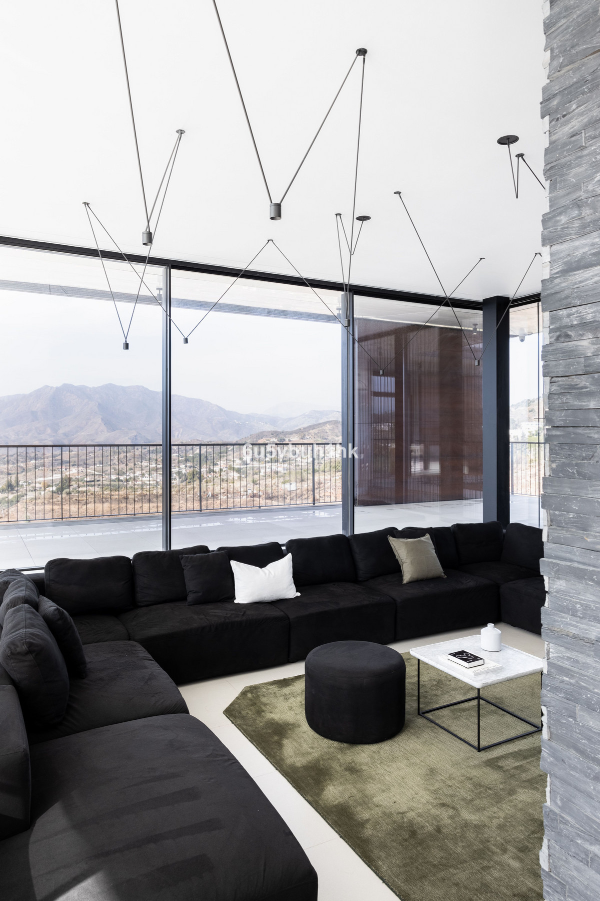 La conception est le fruit d'une collaboration entre le cabinet Marion Regitko Architects et les designers britanniques Soo Wilkinson et John Grant d'Igloo Design. Leur approche holistique des espaces intérieurs et extérieurs de la villa, ainsi que la continuité des matériaux et des finitions, confèrent à cette demeure exclusive une fluidité parfaite. De n'importe quel point de la maison, on accède à la terrasse qui entoure la villa à l'étage. Le niveau inférieur, creusé dans la colline, donne l'impression que la villa émerge de la roche.