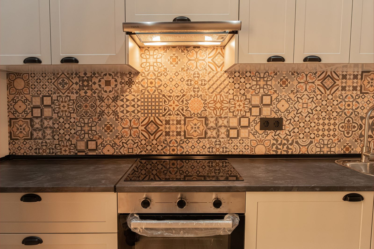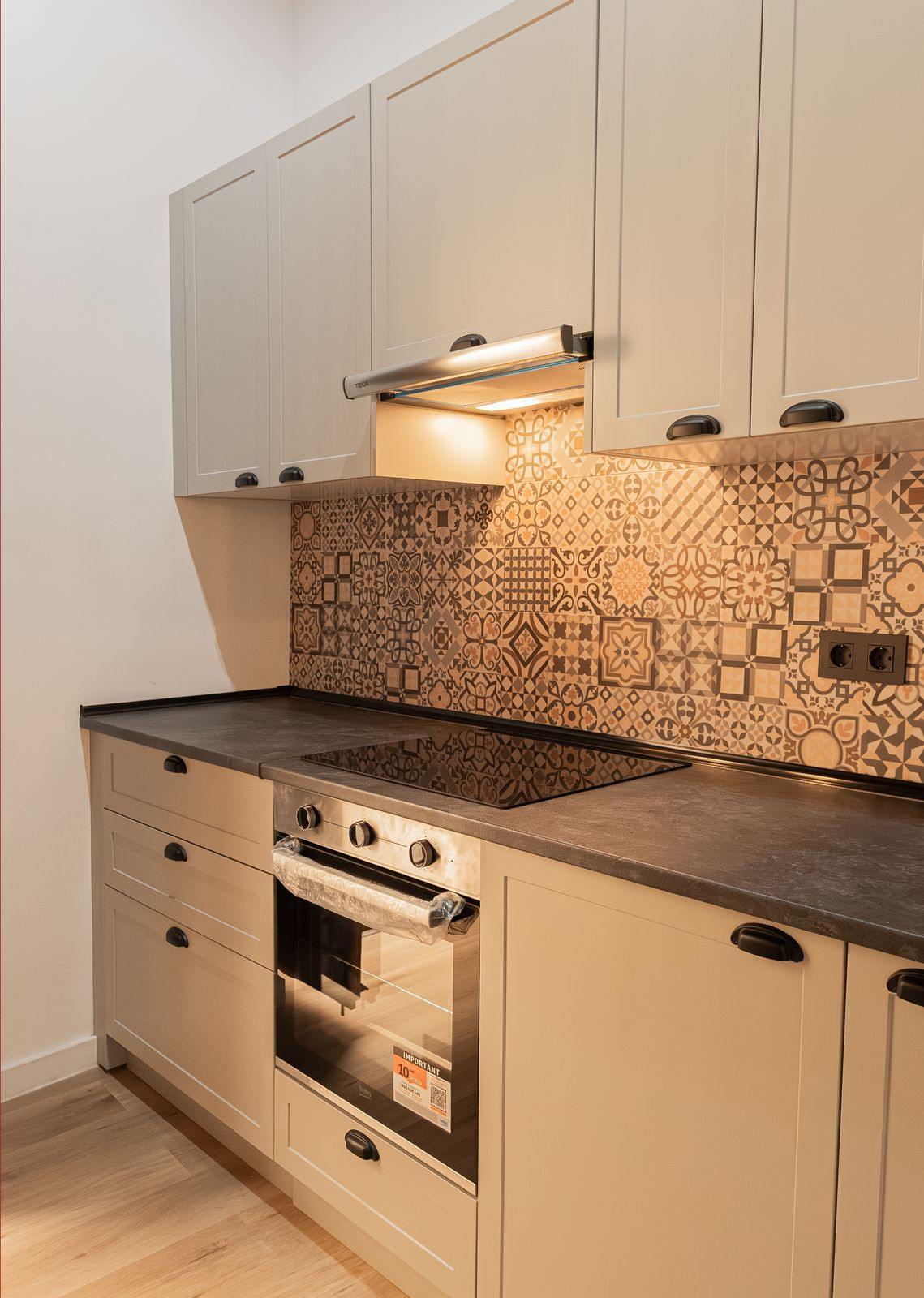 La cuisine, entièrement neuve et conçue sur mesure pour ce bien, comprend une hotte aspirante, une plaque de cuisson vitrocéramique, un four, un lave-linge séchant et un réfrigérateur intégré — le tout neuf et jamais utilisé, et inclus dans le prix. Le mobilier du salon et de la chambre est également neuf et jamais utilisé.