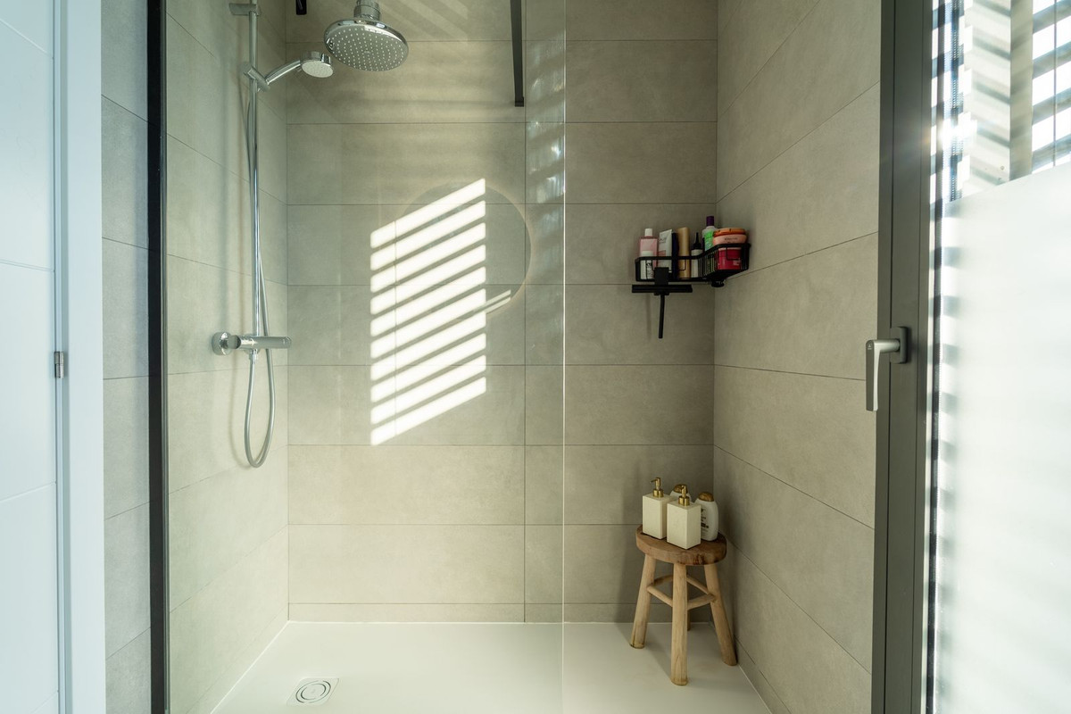 À l'étage, le premier niveau abrite la chambre principale, impressionnante, avec placards intégrés, store électrique, salle de bains attenante et vue sur la mer depuis le lit. On y trouve également deux autres chambres doubles et une salle de bains.