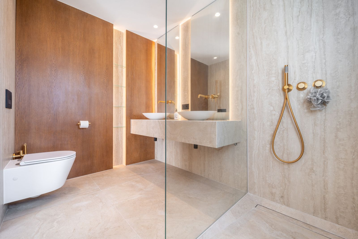 En montant l'escalier, vous découvrirez un vaste palier orné d'un magnifique parquet en chêne à chevrons et d'une rampe sur mesure. À gauche se trouve la chambre d'amis, une pièce aux proportions harmonieuses dotée d'armoires vitrées rétroéclairées sur mesure, dont l'intérieur est doublé de lin, assorti au papier peint de la chambre. Cette chambre dispose d'une salle de bains privative entièrement carrelée de travertin, avec des niches rétroéclairées et des étagères en verre suspendues, un chauffage au sol et un meuble vasque assorti, surmonté d'un miroir rétroéclairé sur mesure.