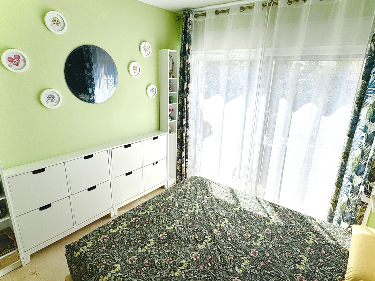 Chambre principale avec salle de bains attenante et accès à une terrasse ensoleillée ; 2 chambres supplémentaires avec placards intégrés et une deuxième salle de bains.