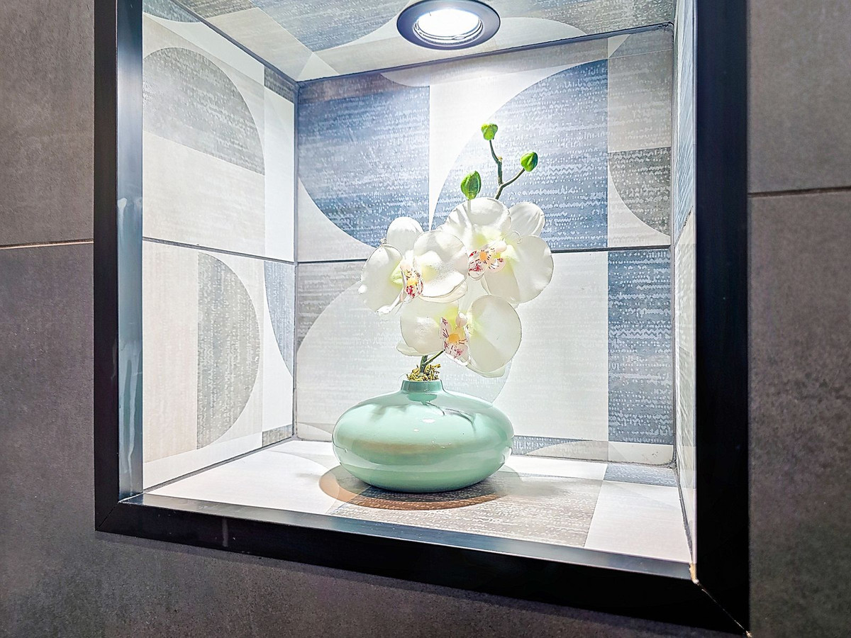 Salle de bains avec douche à l'italienne effet pluie. La chambre principale est un studio magnifiquement meublé.