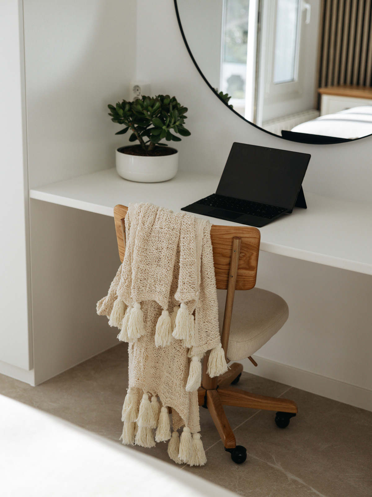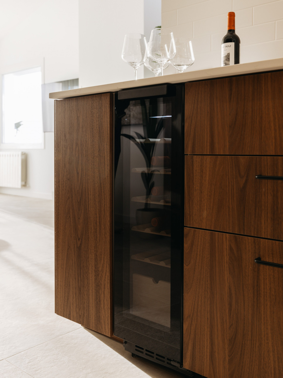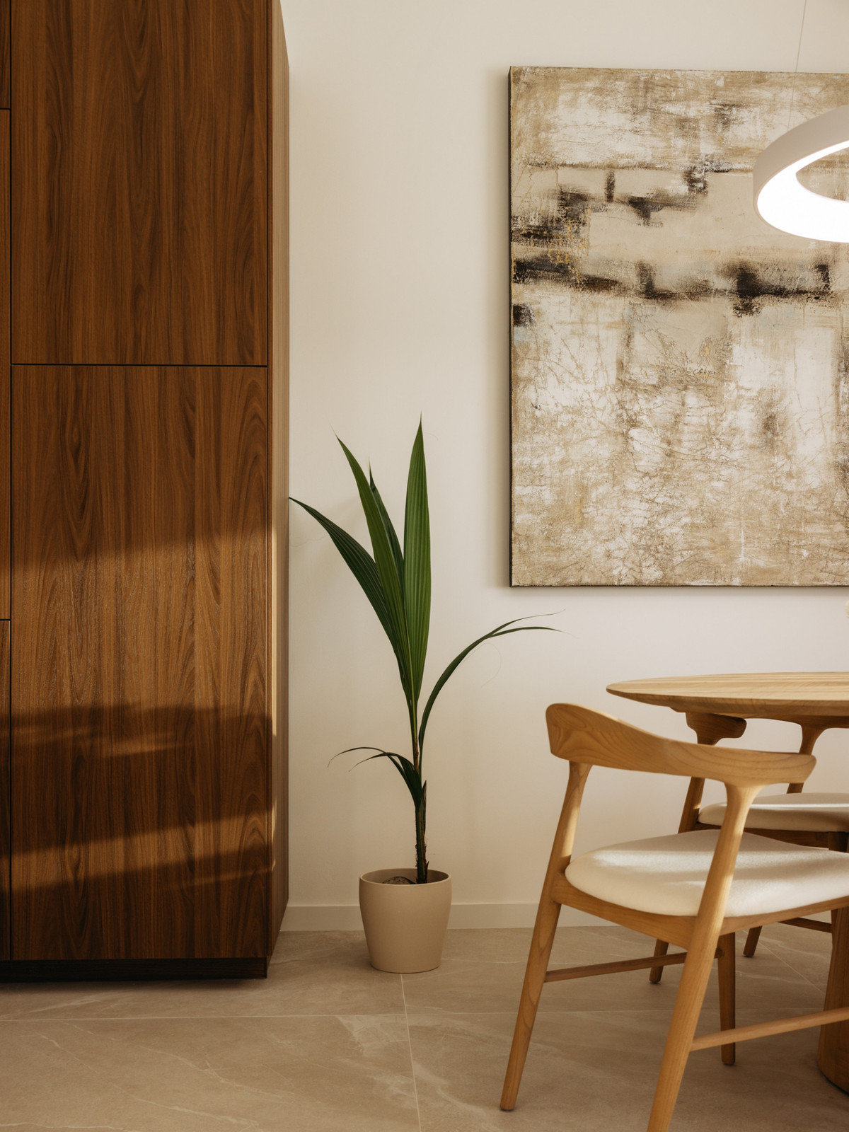 Juste devant la fenêtre de la cuisine, un charmant citronnier apporte une authentique touche méditerranéenne, s'harmonisant parfaitement avec le design nordique épuré de la maison. De ce niveau, vous accédez directement à une terrasse privée, idéale pour les repas en plein air, la détente et pour admirer les couchers de soleil spectaculaires sur la vallée du golf.