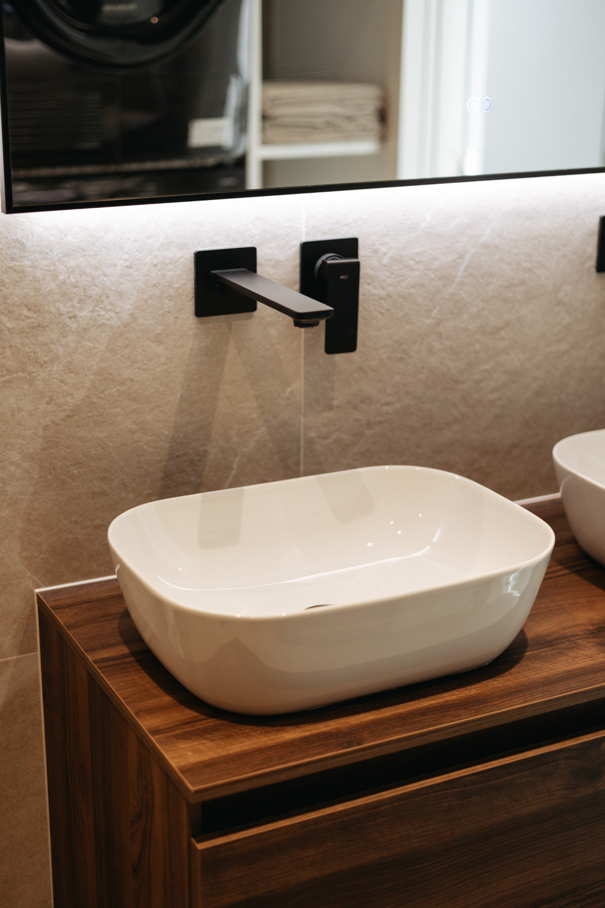 L'étage inférieur comprend deux chambres spacieuses avec lits doubles, placards intégrés et un grand débarras. L'élégante salle de bains est équipée d'une douche à effet pluie, d'un chauffage au sol et d'un lave-linge séchant pour plus de confort.