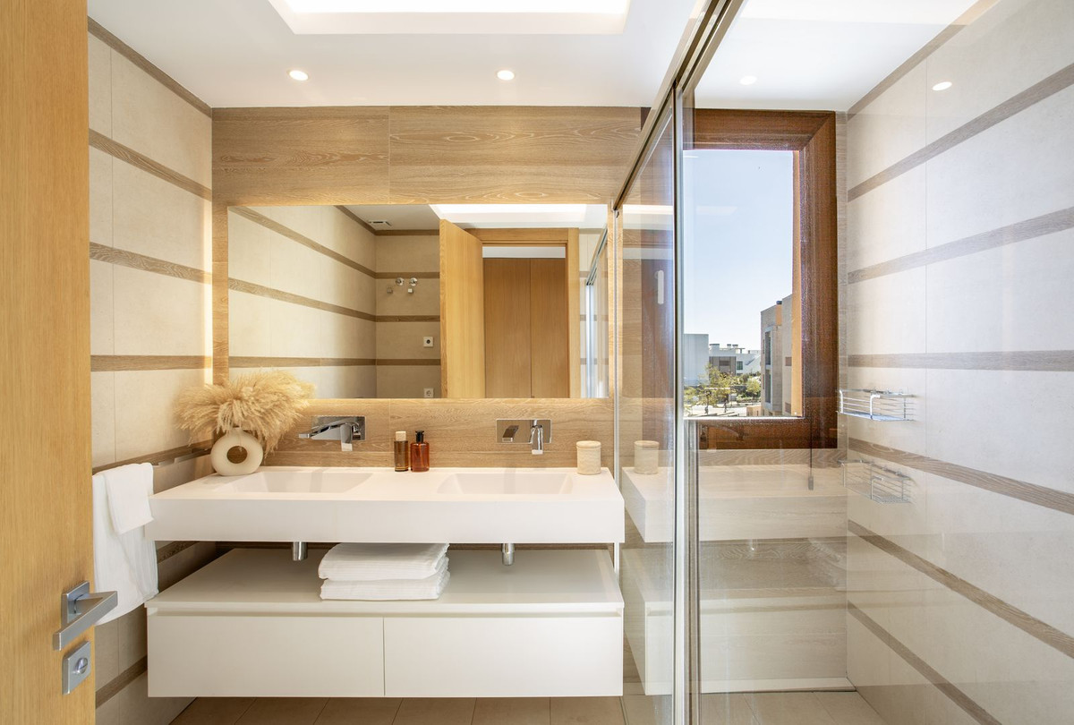 La propriété comprend 3 chambres et 2 salles de bains et demie et bénéficie d'un vaste espace de vie ouvert comprenant un salon et une cuisine d'environ 50 m². Une superbe terrasse couverte et découverte est accessible depuis le salon et la suite parentale. Elle mène ensuite à un impressionnant solarium sur le toit, entièrement aménagé avec un bassin chauffé, des toilettes invités, une douche et une cuisine équipée d'un barbecue, de réfrigérateurs et d'un congélateur, le tout sous une pergola électrique.