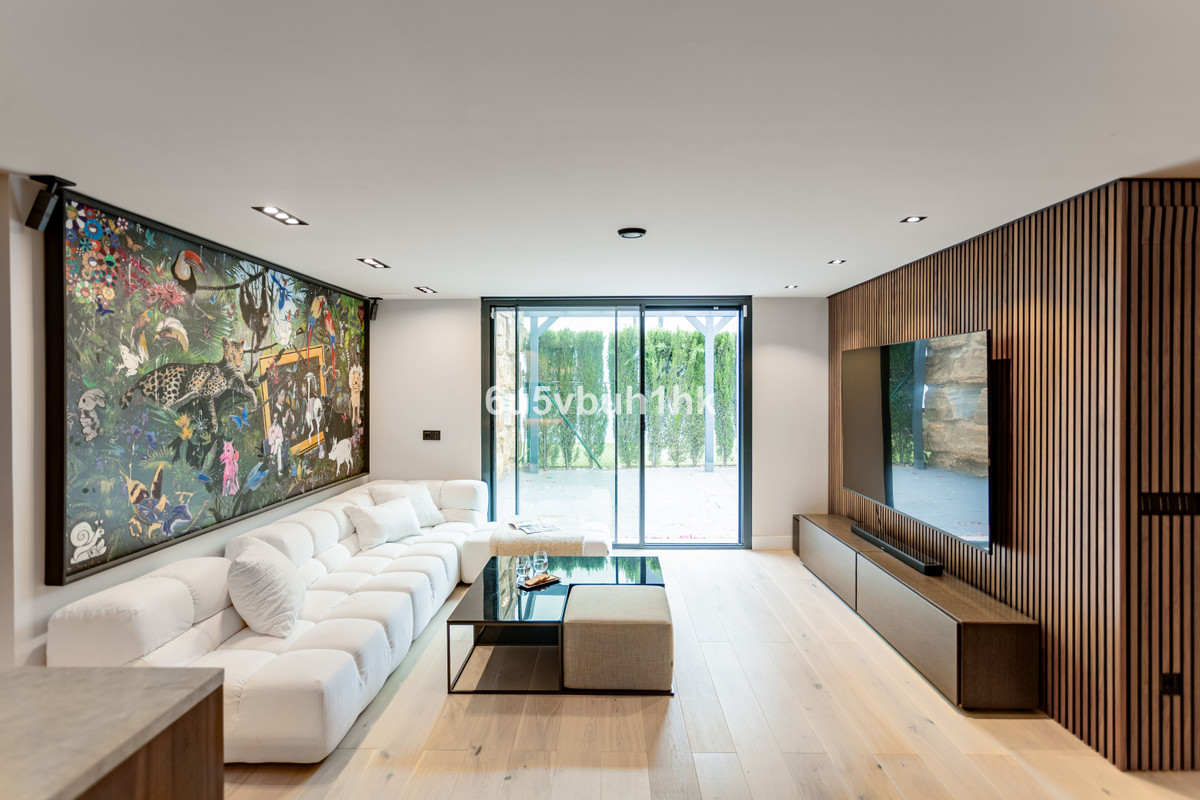 Située dans le quartier exclusif et sécurisé de Resina Golf à Estepona, cette villa entièrement rénovée offre un niveau de vie exceptionnel. Avec une attention méticuleuse aux détails et des finitions haut de gamme, la propriété allie design contemporain, fonctionnalité et confort dans l'un des quartiers résidentiels les plus prisés de la Costa del Sol. Implantée sur un terrain privé de 765 m², la villa offre de généreux espaces intérieurs et extérieurs sur trois niveaux. Au rez-de-chaussée, vous trouverez une cuisine ouverte haut de gamme signée Decodan, parfaitement connectée à un spacieux séjour avec cheminée design. De grandes baies vitrées intégrées offrent une vue imprenable et dégagée sur la mer Méditerranée sous tous les angles. Ce niveau principal comprend également une chambre avec salle de bain complète, dressing privé et toilettes invités. La terrasse extérieure de 190 m² est conçue pour profiter pleinement du cadre privilégié de la villa. Elle dispose d'une piscine à débordement chauffée, d'un espace barbecue entièrement équipé, d'une pergola ombragée pour les repas en plein air et d'un confortable espace détente, le tout avec une vue imprenable sur la mer et le littoral africain. La villa dispose d'un magnifique jardin paysager avec système d'arrosage automatique, situé juste en face de la piscine. Des arbres centenaires et des plantes bien établies créent un environnement luxuriant et serein, offrant intimité et beauté naturelle tout au long de l'année. Le niveau supérieur comprend deux vastes chambres avec salle de bain attenante, un espace de travail dédié et une terrasse de 55 m² idéale pour se détendre au soleil tout en admirant la vue panoramique. Le niveau inférieur est conçu pour le plaisir et les loisirs. Il comprend une élégante chambre d'amis avec salle de bain attenante, un bar et une salle de cinéma entièrement équipés, une salle de sport ultramoderne, une buanderie, un local technique et un grand espace de rangement. La propriété bénéficie également du chauffage au sol, de volets électriques et d'un parking pour trois véhicules. Entourée d'un paysage luxuriant et située au cœur d'un paisible complexe de golf, la villa offre intimité et sécurité dans un cadre naturel exceptionnel. L'emplacement est très pratique : une école internationale, des restaurants, un club de paddle et un supermarché sont à moins de 3 minutes en voiture. La promenade côtière permet d'accéder facilement à la vieille ville historique d'Estepona et à son port de plaisance animé. Si vous souhaitez avoir plus d'informations ou organiser une visite privée de cette propriété exceptionnelle, n'hésitez pas à nous contacter !