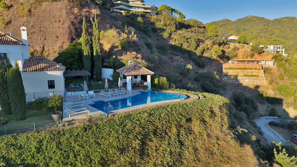 Située au sein du domaine sécurisé de Monte Mayor, cette villa de style classique est accessible par une allée privée fermée, offrant une véritable intimité et une arrivée majestueuse. Orientée plein sud et en position dominante, elle bénéficie d'une vue panoramique sur les montagnes environnantes et la mer Méditerranée.