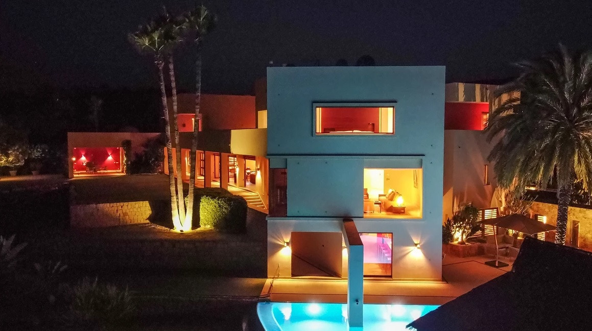 Les pièces principales, décorées avec les plus beaux meubles Georgetti et la cuisine, ont toutes accès à l'extérieur avec certaines zones aux couleurs fortes propres à Barragan. Des murs lumineux accentuent l'espace sur les terrasses près de l'étang de Koi et de l'espace barbecue extérieur protégé du soleil, qui se connecte à un jardin sur deux niveaux avec une fontaine et un mur de couleur vive, protégé du vent et offrant une intimité totale. La piscine à débordement avec sa superbe mosaïque Siccis, sa terrasse en bois IPE et sa cabane de style mexicain. La partie de style la plus spectaculaire de ce manoir est le spacieux espace de vie extérieur avec toit en verre et volets électriques en treillis sculpté qui jouent avec la qualité toujours changeante de la lumière et de l'ombre du toit et de la partie avant séparant le jardin sans enlever la vue sur la mer.