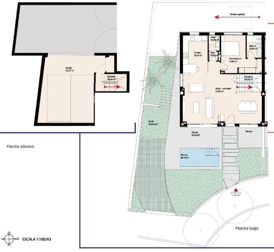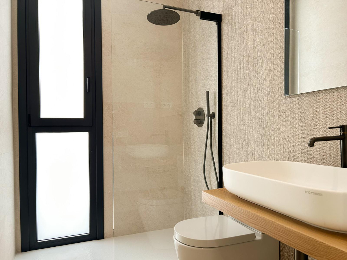 Main floor: Features a spacious, bright living room with a fully equipped open-plan kitchen, designed for both functionality and modern aesthetics. The living area opens directly onto a generous terrace with a private garden and swimming pool, ideal for enjoying the Mediterranean lifestyle. This level also includes a stylish guest toilet and the main bedroom with an en-suite bathroom, allowing for convenient single-level living if desired.