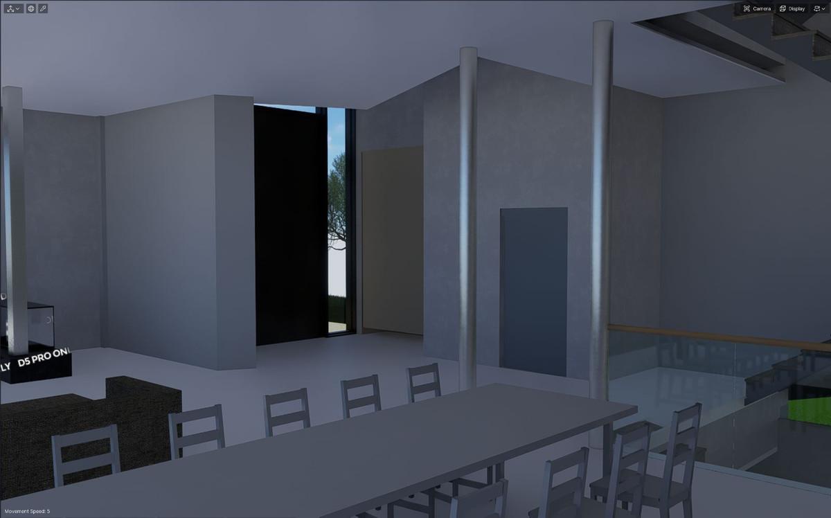 Rez-de-chaussée : Spacieux séjour-salle à manger avec cuisine ouverte et grandes fenêtres donnant sur la terrasse extérieure, ainsi que des toilettes pour invités.