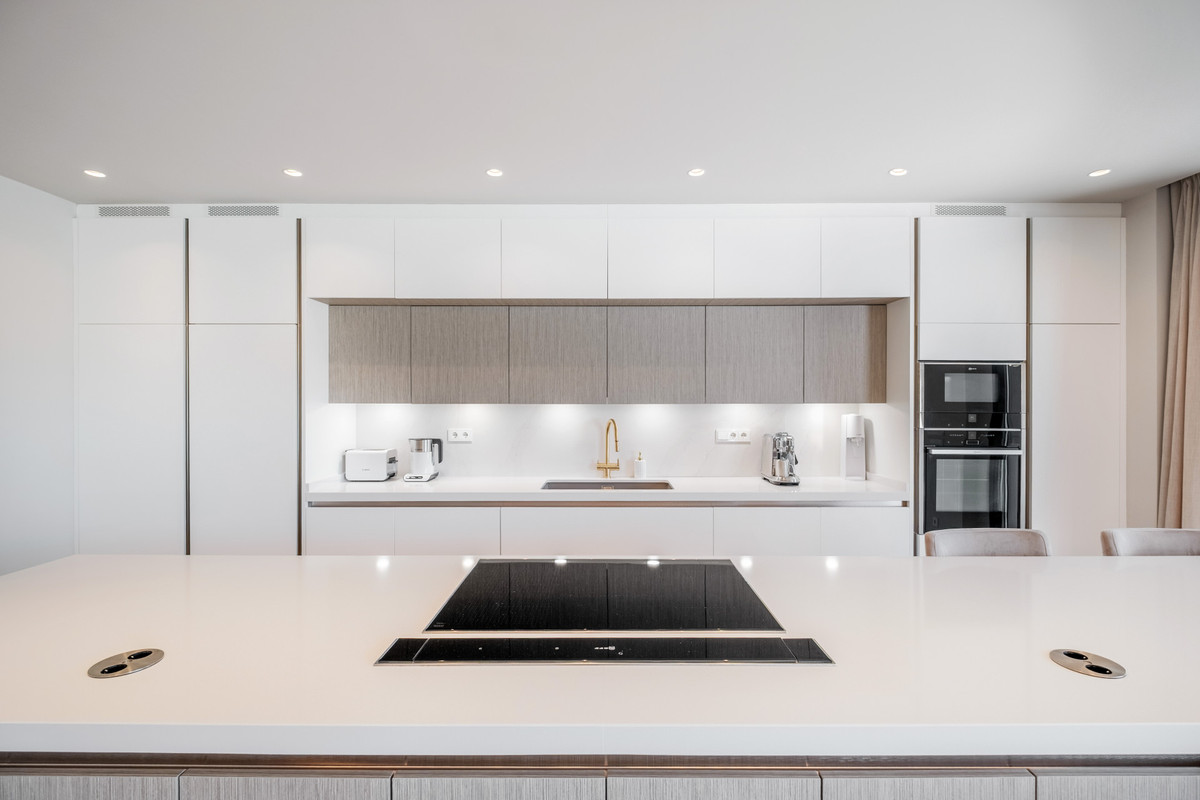 La propriété comprend un hall d'entrée élégant qui mène à un vaste séjour/salle à manger avec cheminée, créant une atmosphère chaleureuse et accueillante. La cuisine design moderne est équipée de meubles sur mesure, d'appareils Neff et d'un élégant plan de travail en Silestone. Depuis le séjour, on accède directement à la grande terrasse, au jardin paysager privé et à la superbe piscine. Cette dernière est revêtue de magnifiques carreaux de grésite couleur émeraude et est pré-équipée pour le chauffage. Le jardin offre un espace extérieur paisible et intime, idéal pour se détendre ou recevoir.