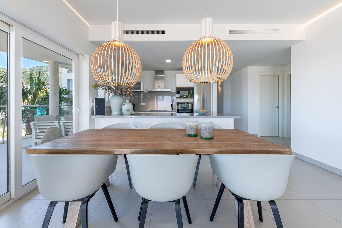 Le cœur de la maison est le spacieux salon avec cuisine ouverte, un espace contemporain et fonctionnel équipé d'appareils Siemens et d'un plan de travail en Silestone, idéal pour la vie quotidienne comme pour recevoir.