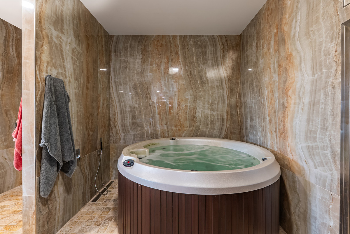 Équipements : Terrasse couverte, Ascenseur, Placards aménagés, Terrasse privée, Solarium, Wi-Fi, Salle de sport, Sauna, Salle de jeux, Local de rangement, Buanderie, Sol en marbre, Jacuzzi, Bar, Barbecue, Domotique, Sous-sol