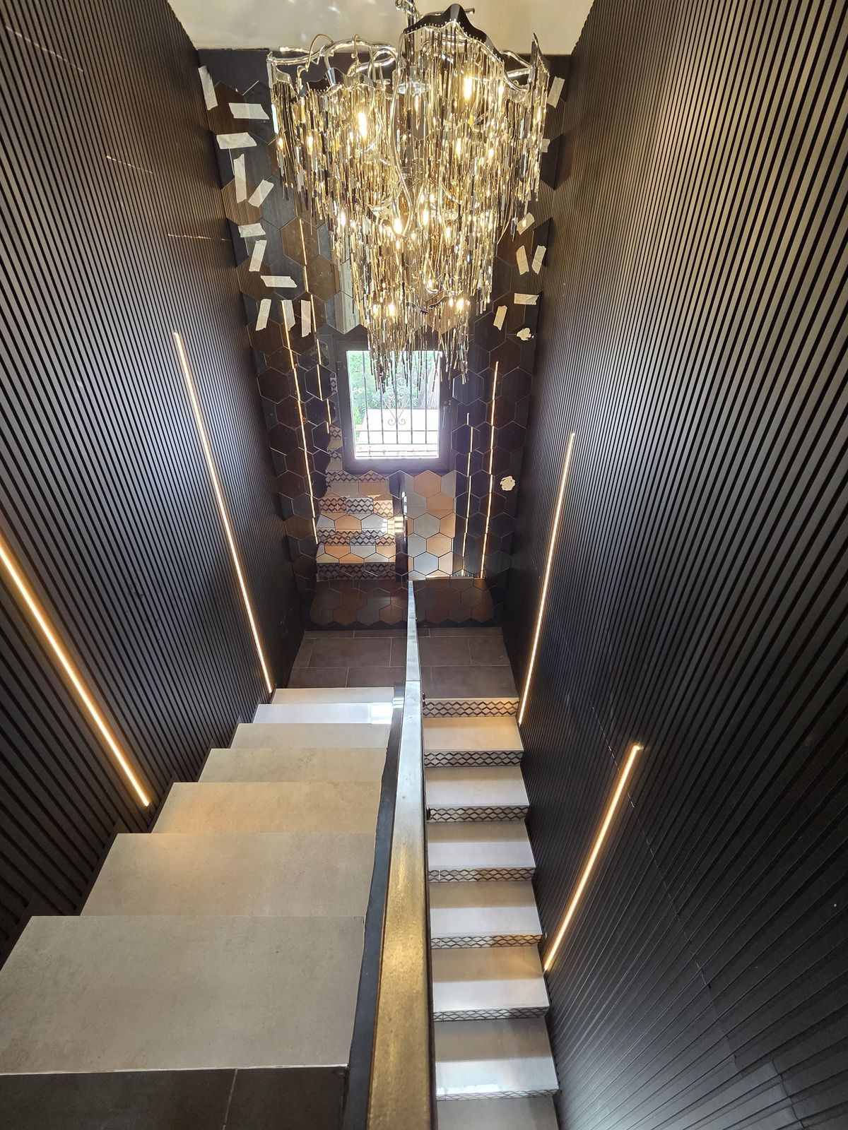 En entrant dans la propriété, vous découvrirez une cuisine luxueuse sur mesure, conçue spécialement pour le propriétaire (elle sera démontée et emportée avec lui lors de son départ). Cet espace peut être réaménagé en pièce à vivre avec cuisine intégrée. Un espace de rangement sous l'escalier abrite le lave-linge.