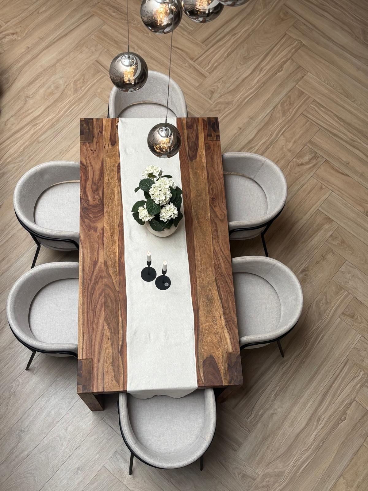 Le niveau principal offre un espace de vie et salle à manger lumineux et ouvert, avec un beau parquet, une cheminée design et de grandes portes vitrées s'ouvrant sur
