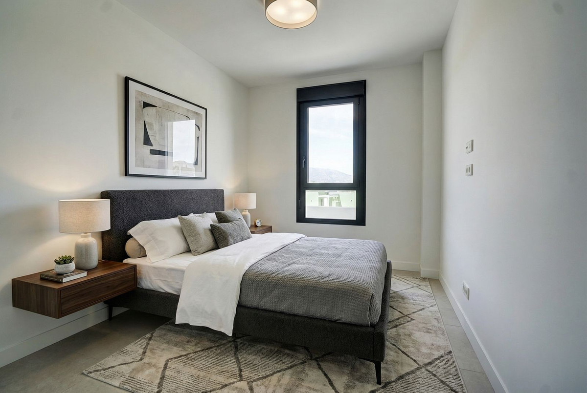 À l'intérieur, l'appartement offre un agencement moderne et lumineux, avec un vaste séjour et une cuisine entièrement équipée d'électroménager haut de gamme. De larges baies vitrées coulissantes relient harmonieusement l'intérieur à la terrasse, optimisant ainsi la lumière naturelle et la transition entre l'intérieur et l'extérieur. La suite parentale dispose d'une salle de bains privative et d'un accès direct à la terrasse, tandis que toutes les chambres sont dotées de placards intégrés et de finitions élégantes, comme un carrelage en porcelaine grand format. L'appartement bénéficie également de deux salles de bains complètes et d'un système de climatisation réversible performant.