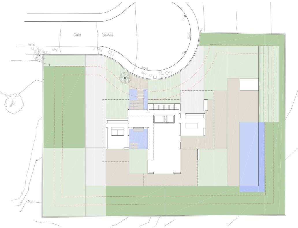 Grâce au zonage UE-3, le terrain de 800 m² permet la construction d'une villa de 317 m² répartie sur deux niveaux, comprenant une terrasse sur le toit et un sous-sol, ainsi que 100 m² de terrasses extérieures pour une transition harmonieuse entre intérieur et extérieur. Un abri pour deux véhicules est également prévu dans les plans.