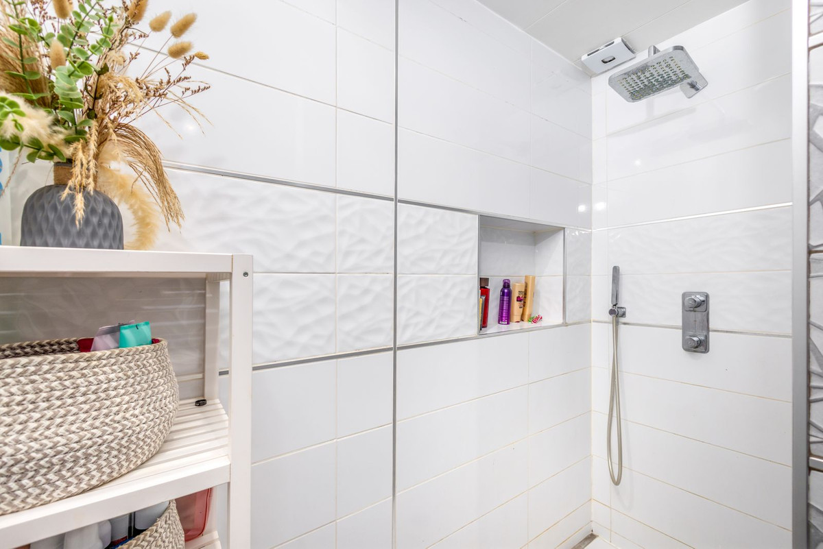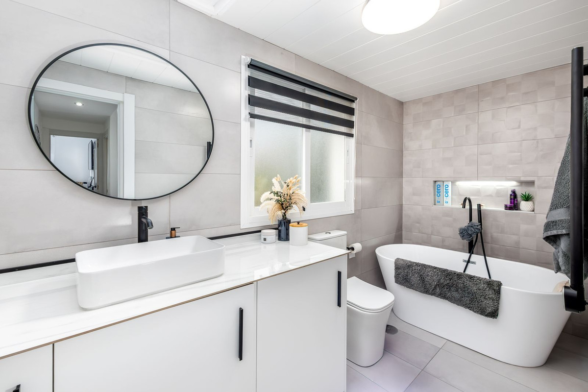 Cette propriété prête à emménager comprend un grand espace ouvert cuisine-salon-salle à manger menant à une terrasse couverte lumineuse et chaleureuse, avec vue sud-sud-ouest sur la chaîne de montagnes d'Alhaurín Golf, Barranco Blanco et au-delà.